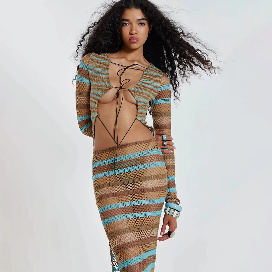 32313 Hollow Knit Skirt Women's Set Patchwork Color 2 Piece Skirt Set