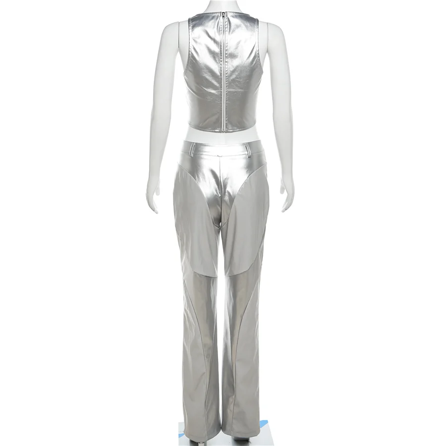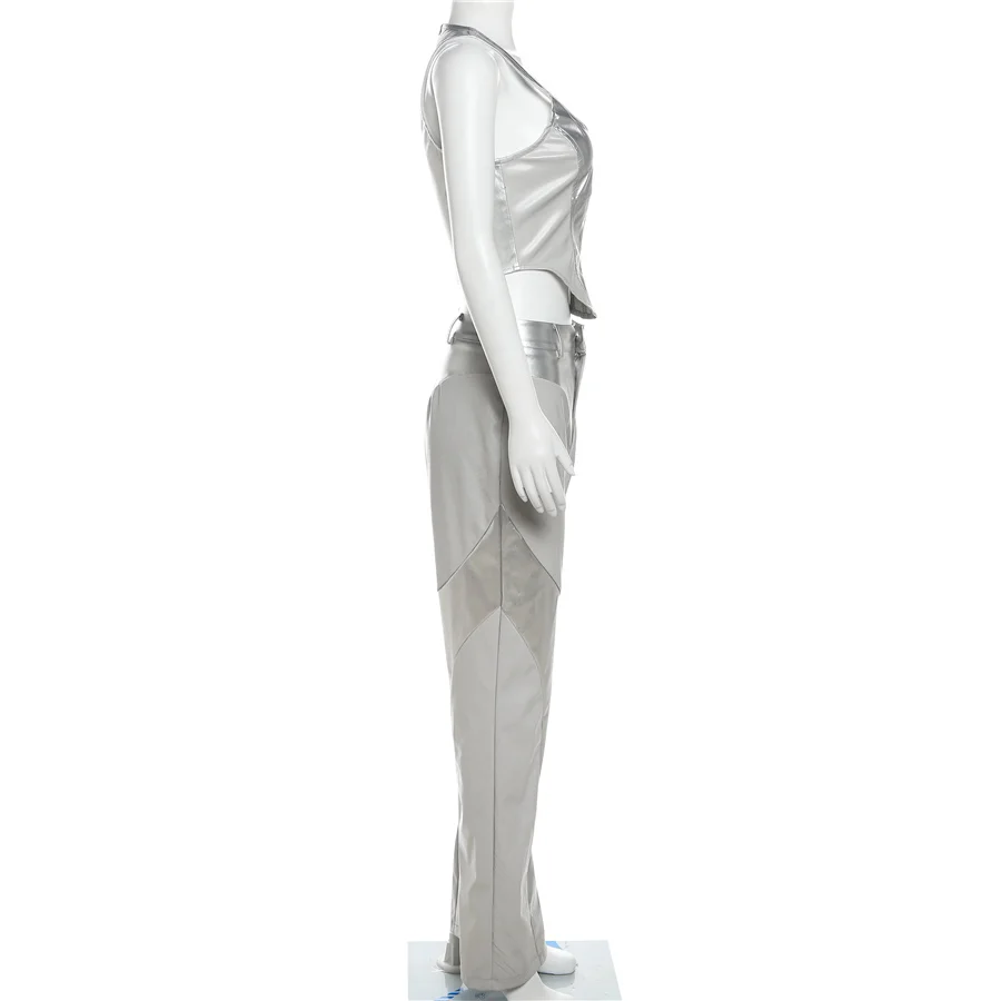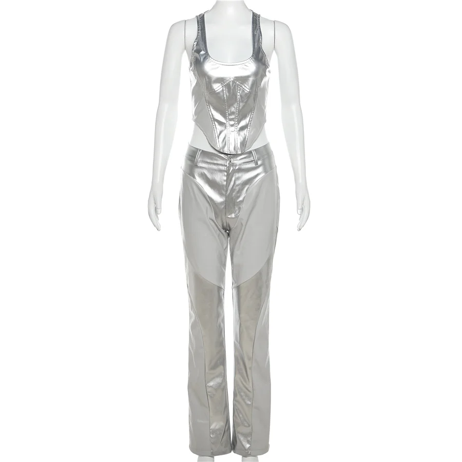 35280 Leather Patchwork Women's Set Lounge Night Club Wear Two Piece Set Women Clothing