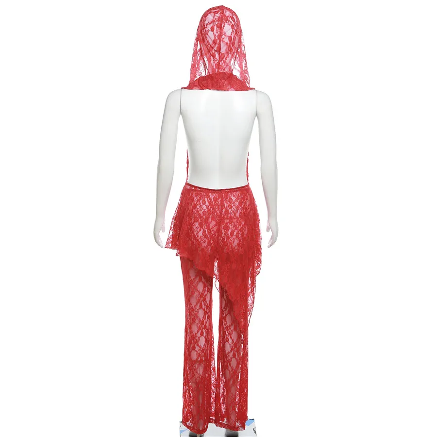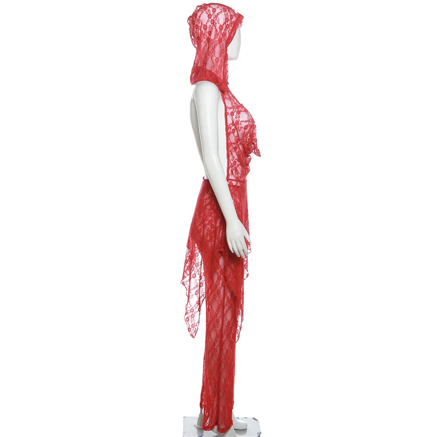 35743 Hood Lace See Through Women's Set Dress Match Pant 2 Piece Set