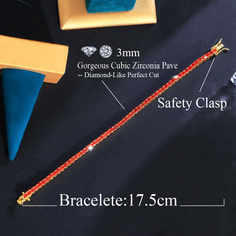 3A Top Quality Cubic Zircon Prong Setting Round 3mm Red CZ Stone Tennis Chain Link Bracelets for Women Engagement Party Jewelry