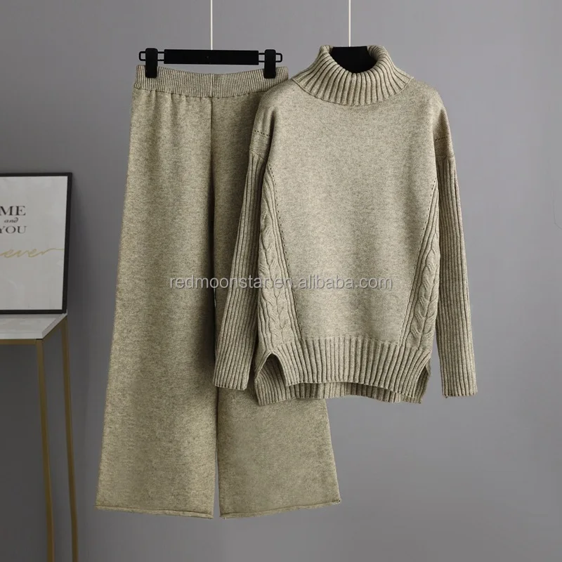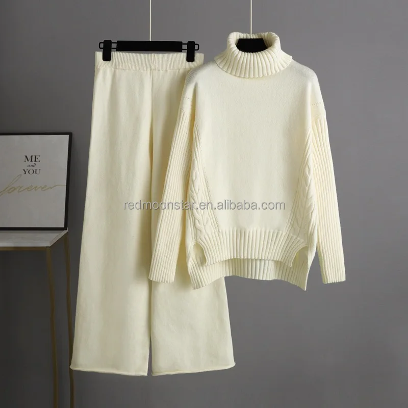 50% Off Autumn and Winter One Size Loose Knitted Suit Women Solid Pulloverneck Sweater Wide Leg Pants Two-piece Knitting Sets