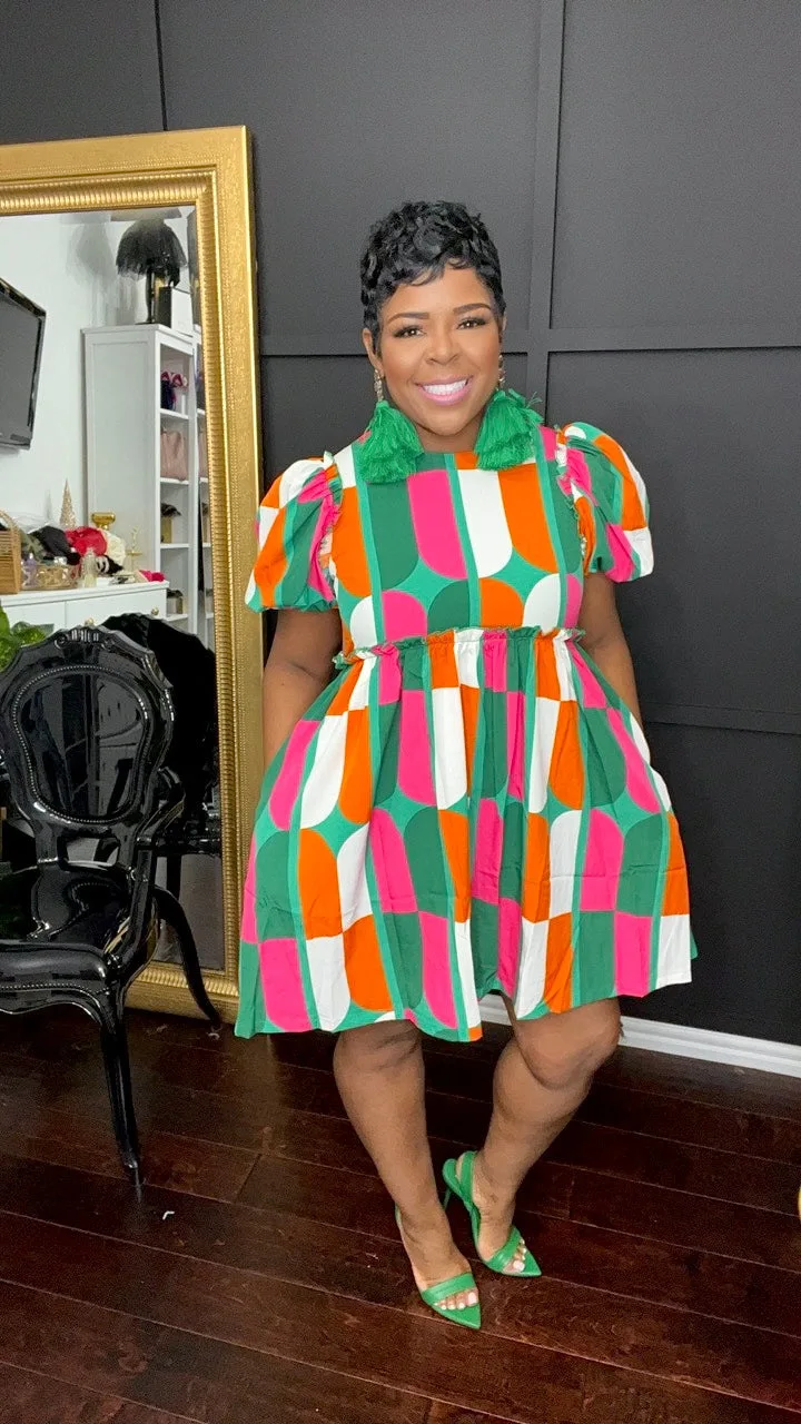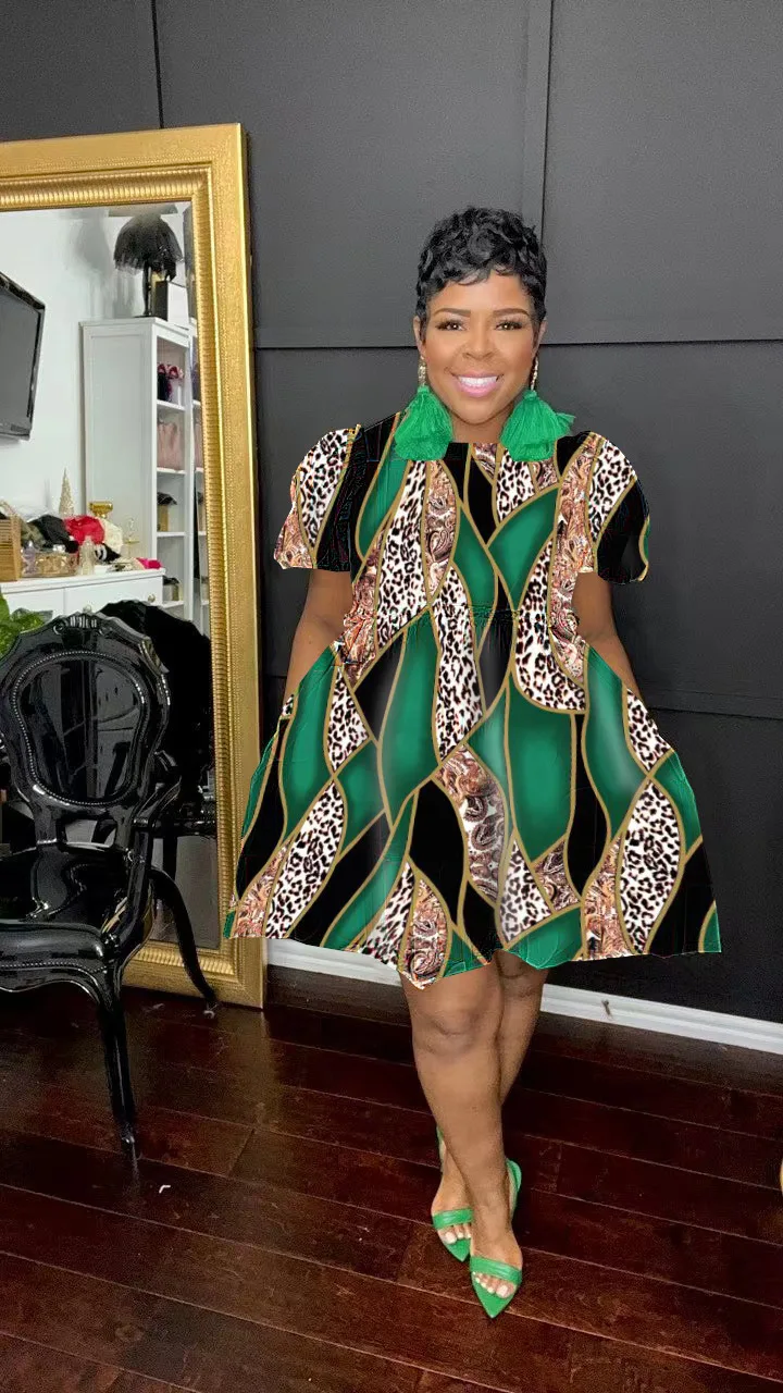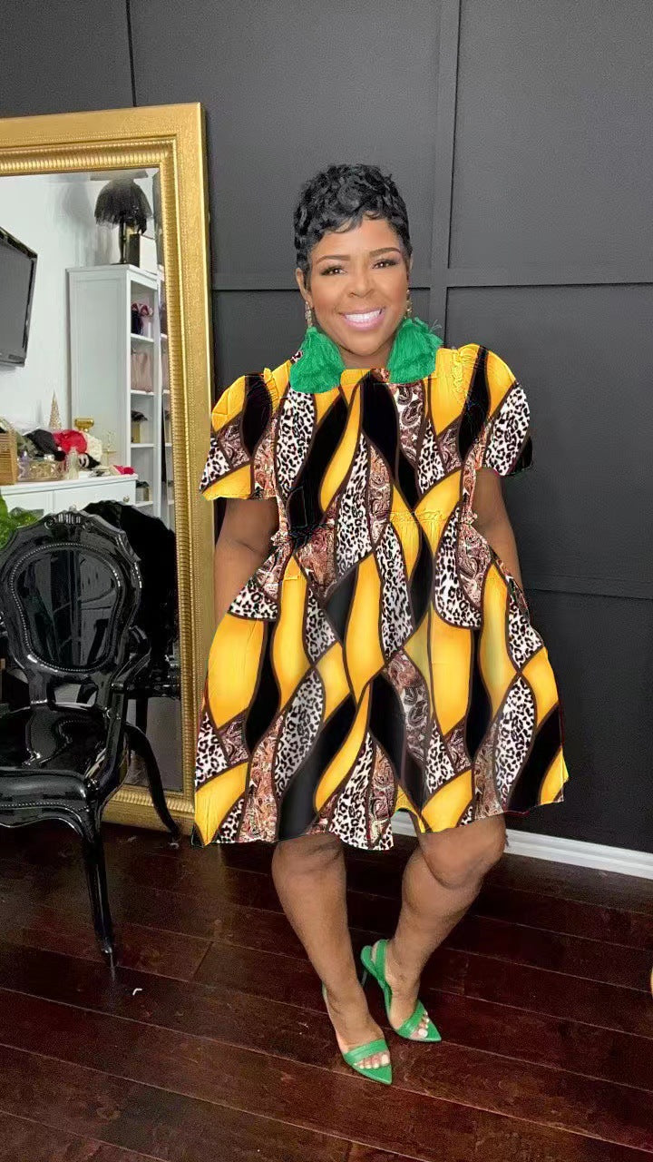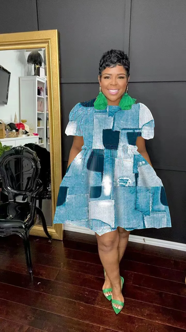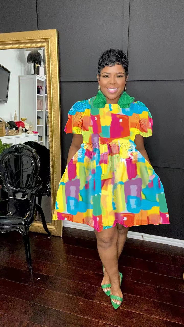 77586 Summer 2023 New Design Color Print Puff Sleeve S-3Xl Plus Size Loose Casual Cake Dresses