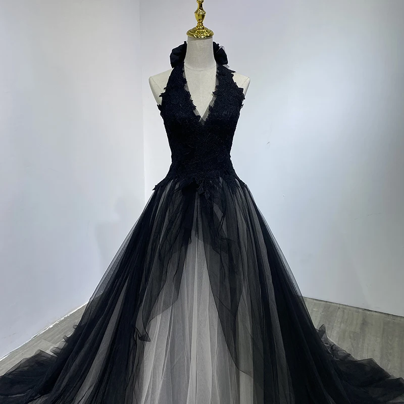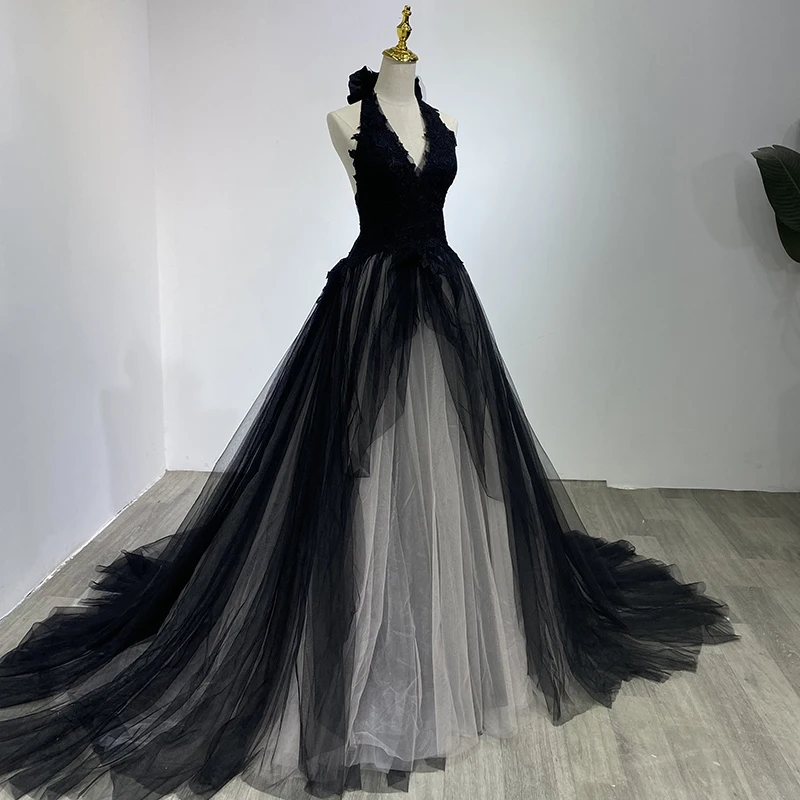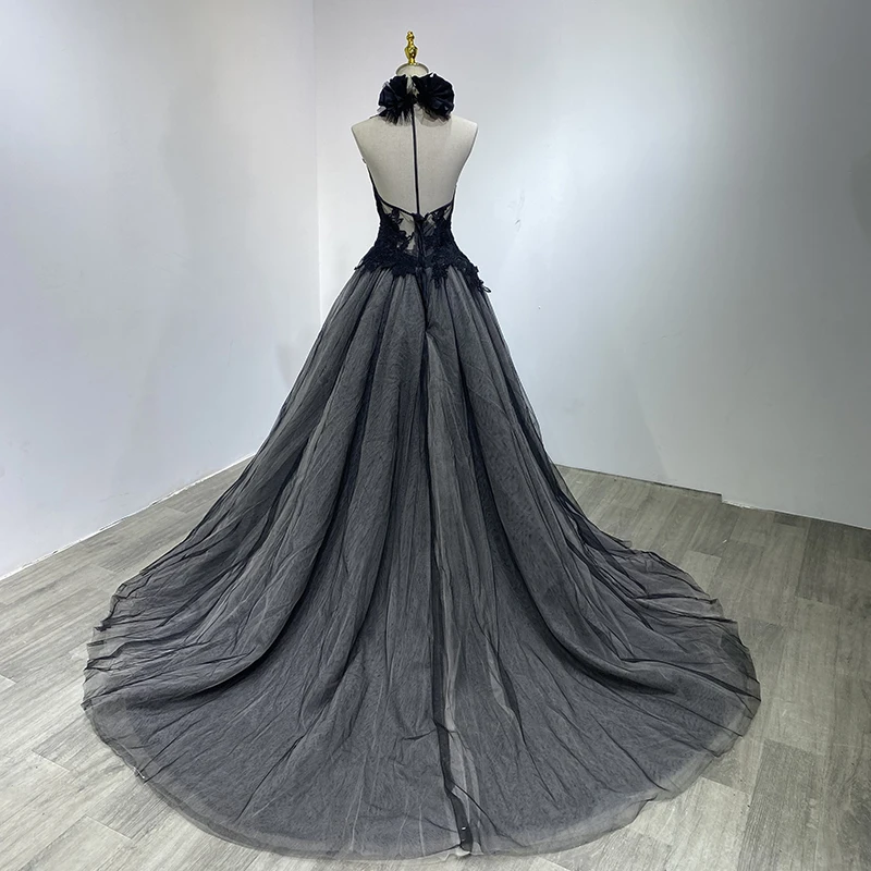 A-line V-neck Black Wedding Dresses Real Photos Floor Length Sleeveless Lace Appliques Tiered Bridal Dress WM06