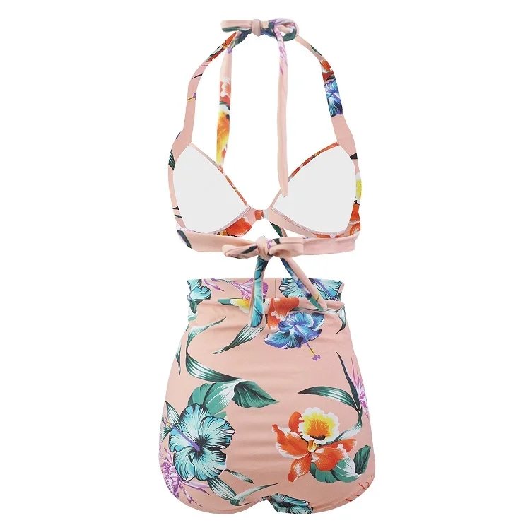 A18019 Plus size two piece swimwear hanging neck front bow swimwear women high waist digital prints Vintage Swimsuits