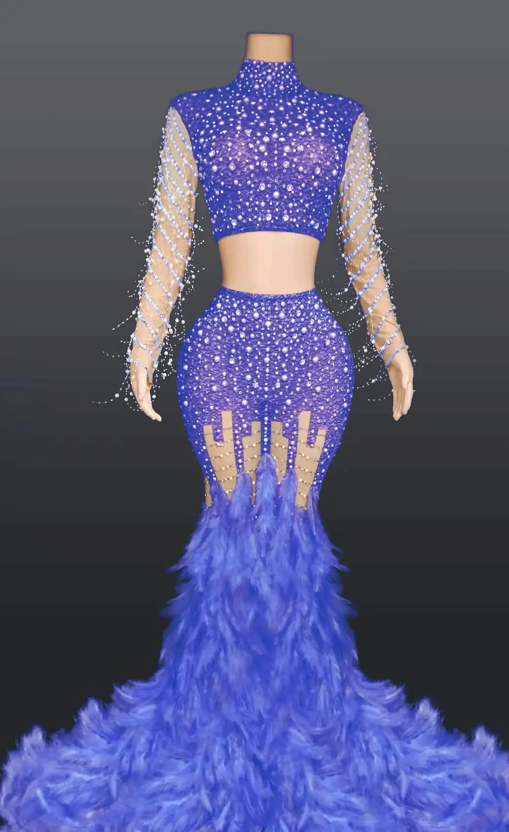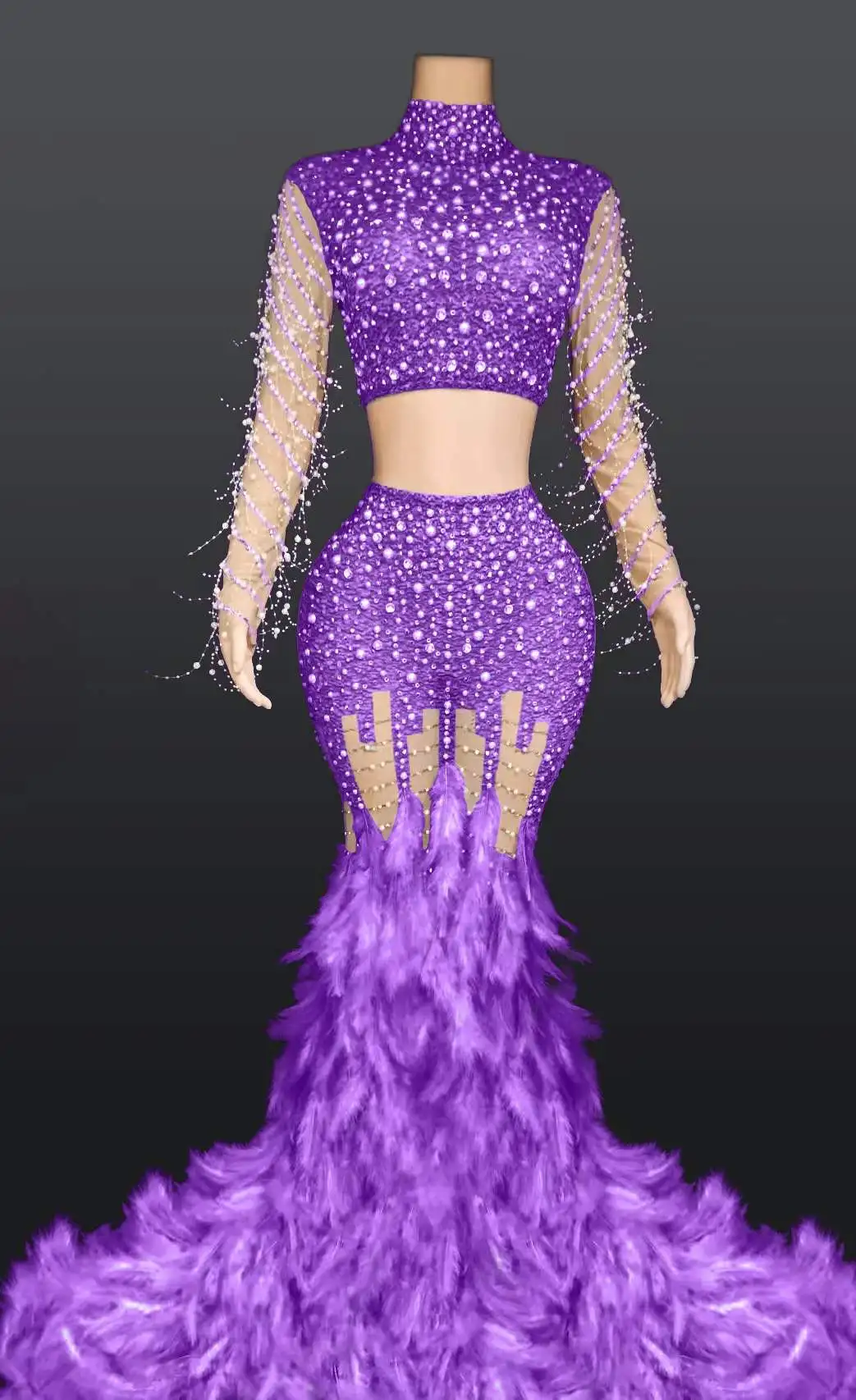 AD1153 Sequin Beaded Sleeve Luxury Dress Rhinestone Evening Gown Feather Fishtail Mesh Two Piece Set Women
