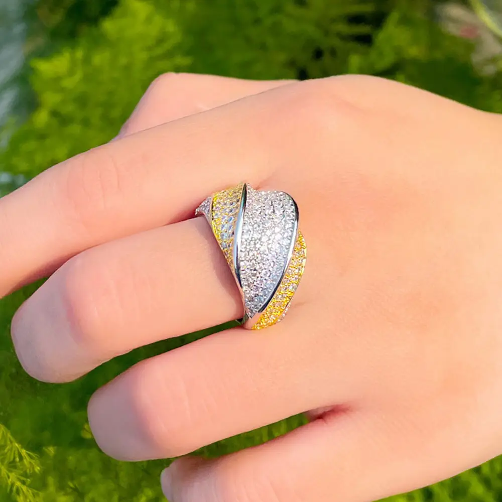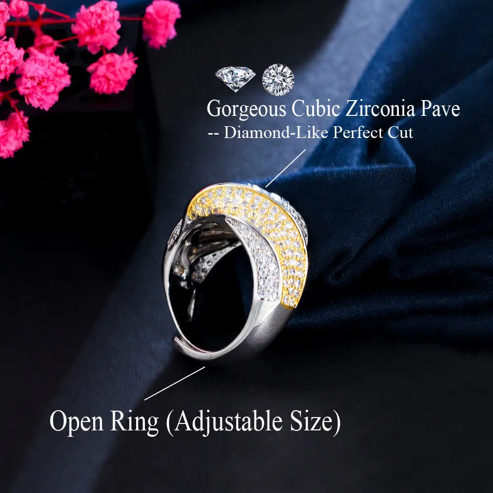 Adjustable Size Gorgeous Cubic Zirconia Two Tone Silver Gold Plated Geometric Twisted Party Cocktail Ring for Women Accessories
