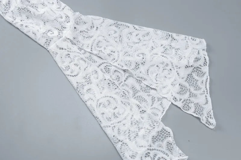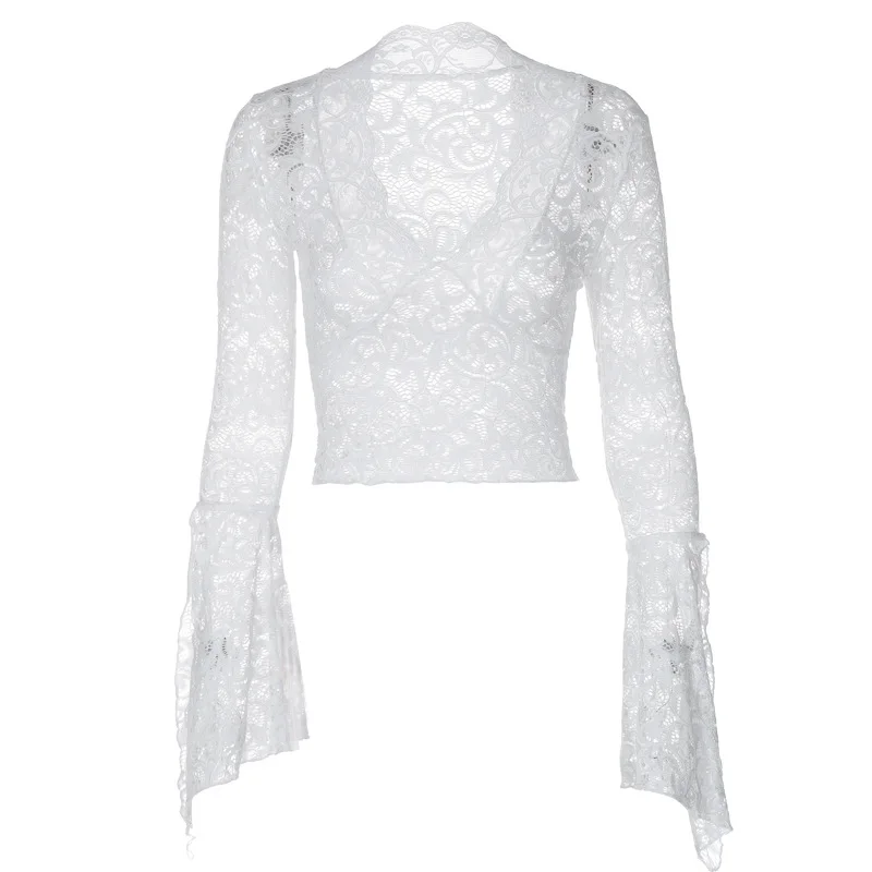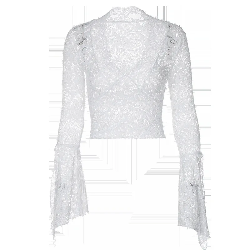 Aesthetic Lace Top Women Sexy Clothing See Through Deep V Neck Flared Long Sleeve T Shirts Party Clothes Clubwear