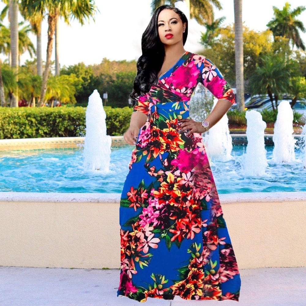Amazon Hot Sale Casual Deep V-neck Print Flower Maxi Dress Plus Size Long Sleeve Prom Fashion Dress