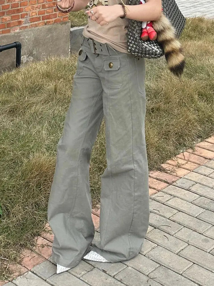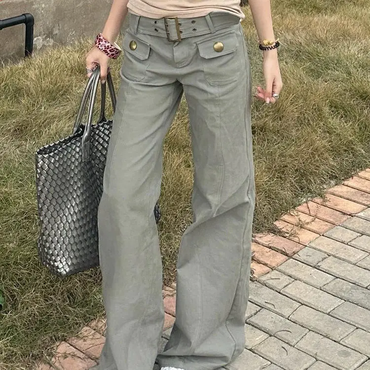 American Block Multi-pocket Functional High-waist Composite Design Waist Work Pants Women Gray Straight Slimming Floor Trousers