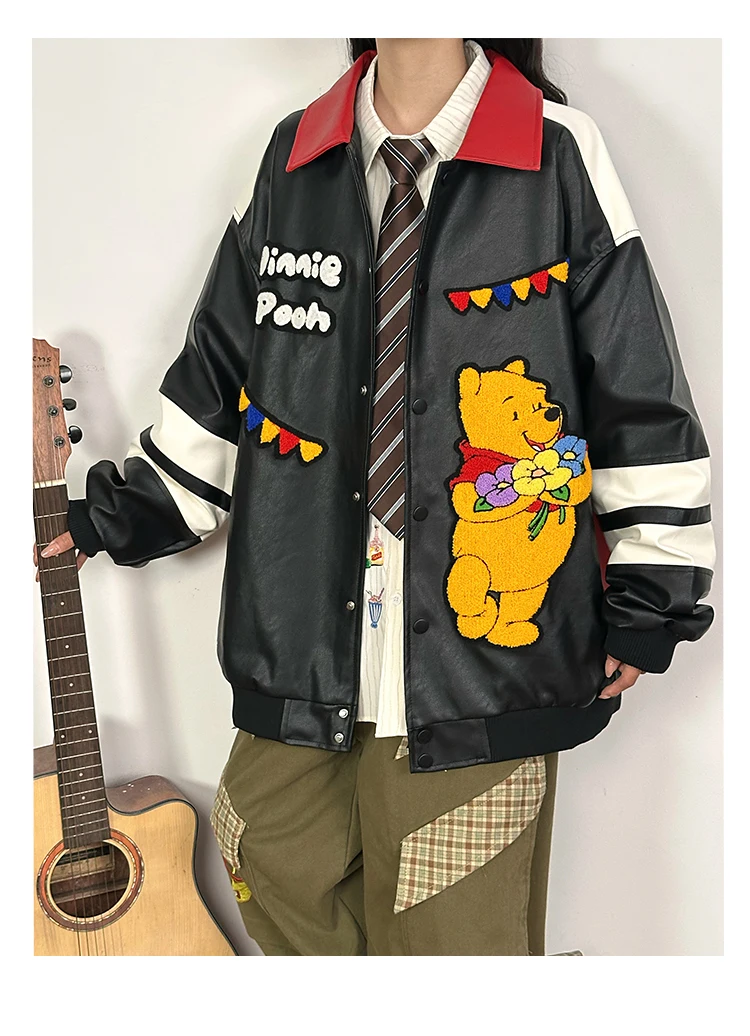 American Retro Bear PU Leather Jacket for Women Autumn and Winter Casual Loose Top Loose-Fitting Casual Couple Leather Jacke