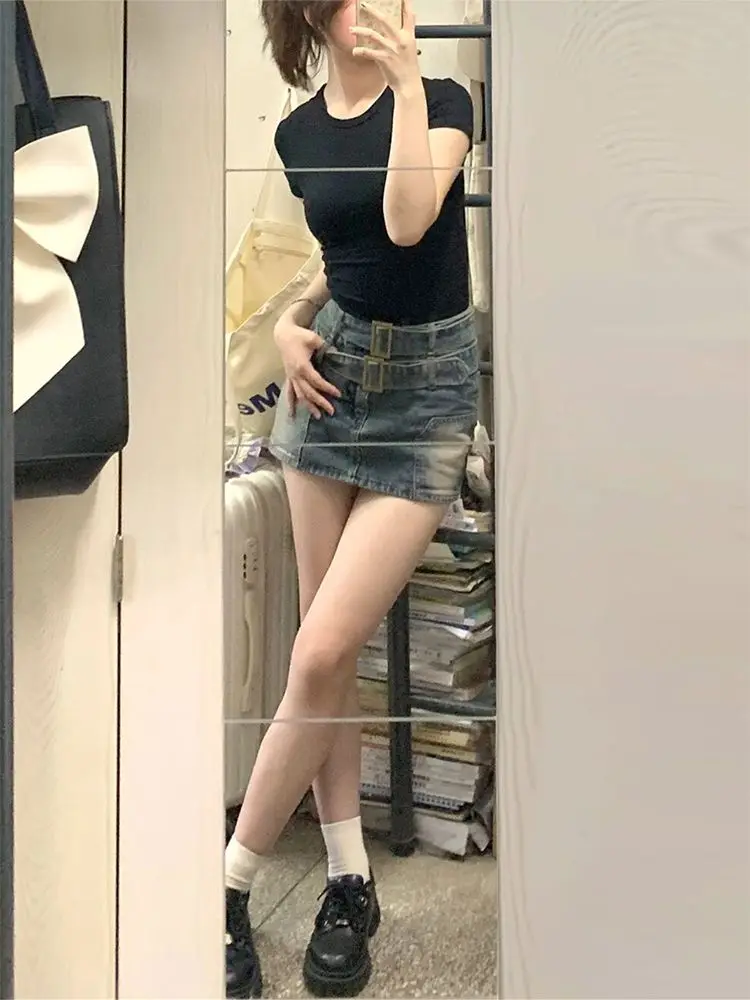 American retro washed and ground white double belt design denim skirt women loose anti-exposure belt lined hip skirt pants