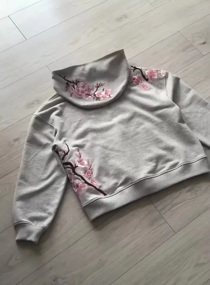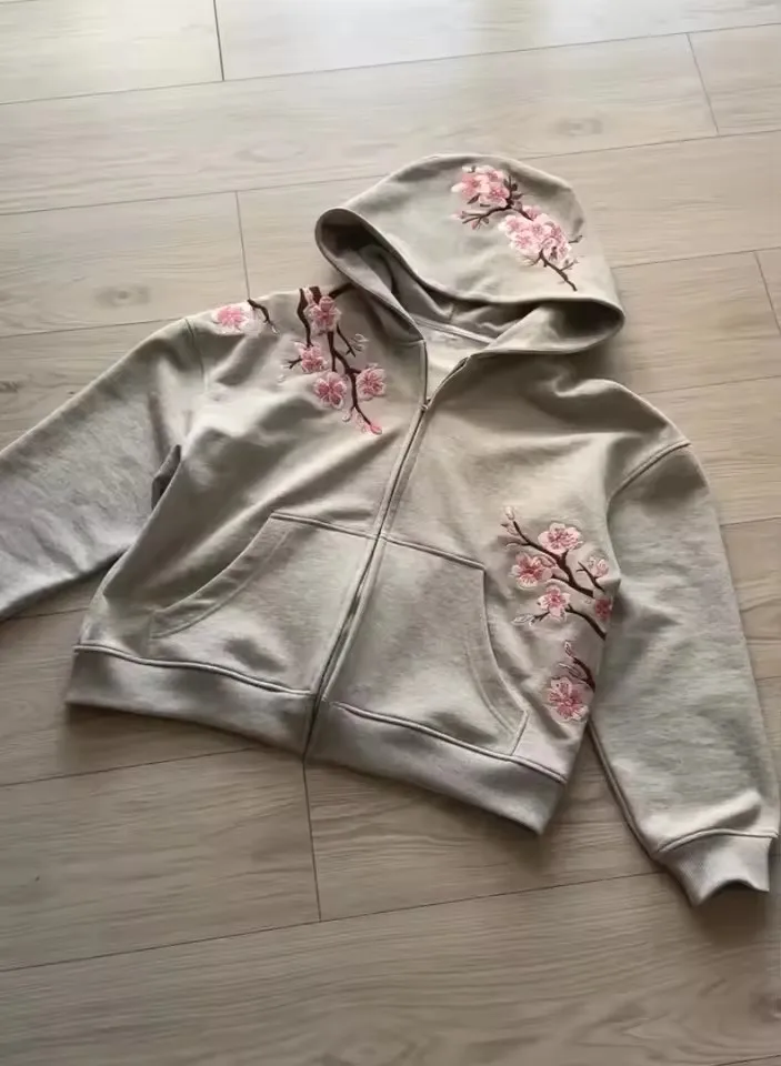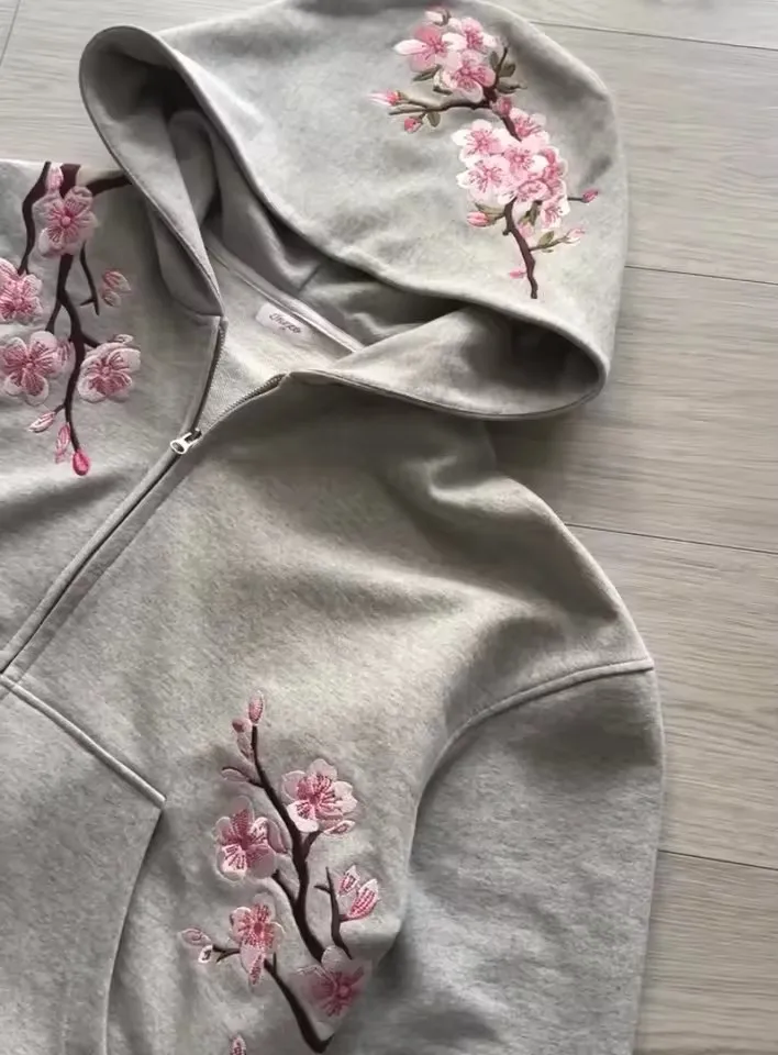 American Vintage Y2K Cherry Blossom Embroidered Hooded Jacket Womens Pink Zipper Coat with Floral Tree Graphic Streetwear