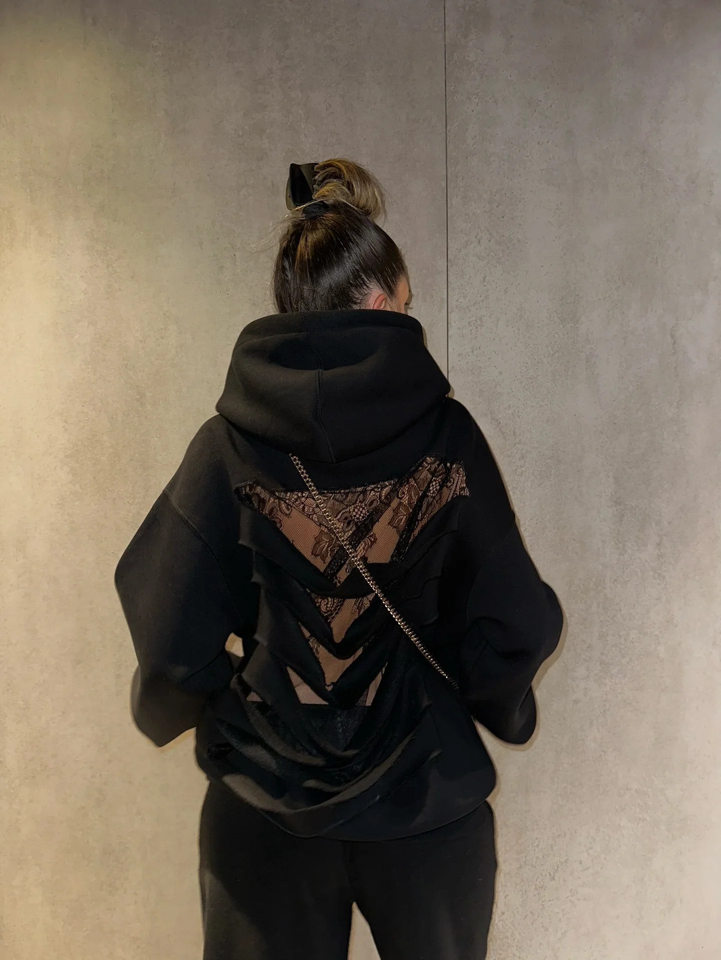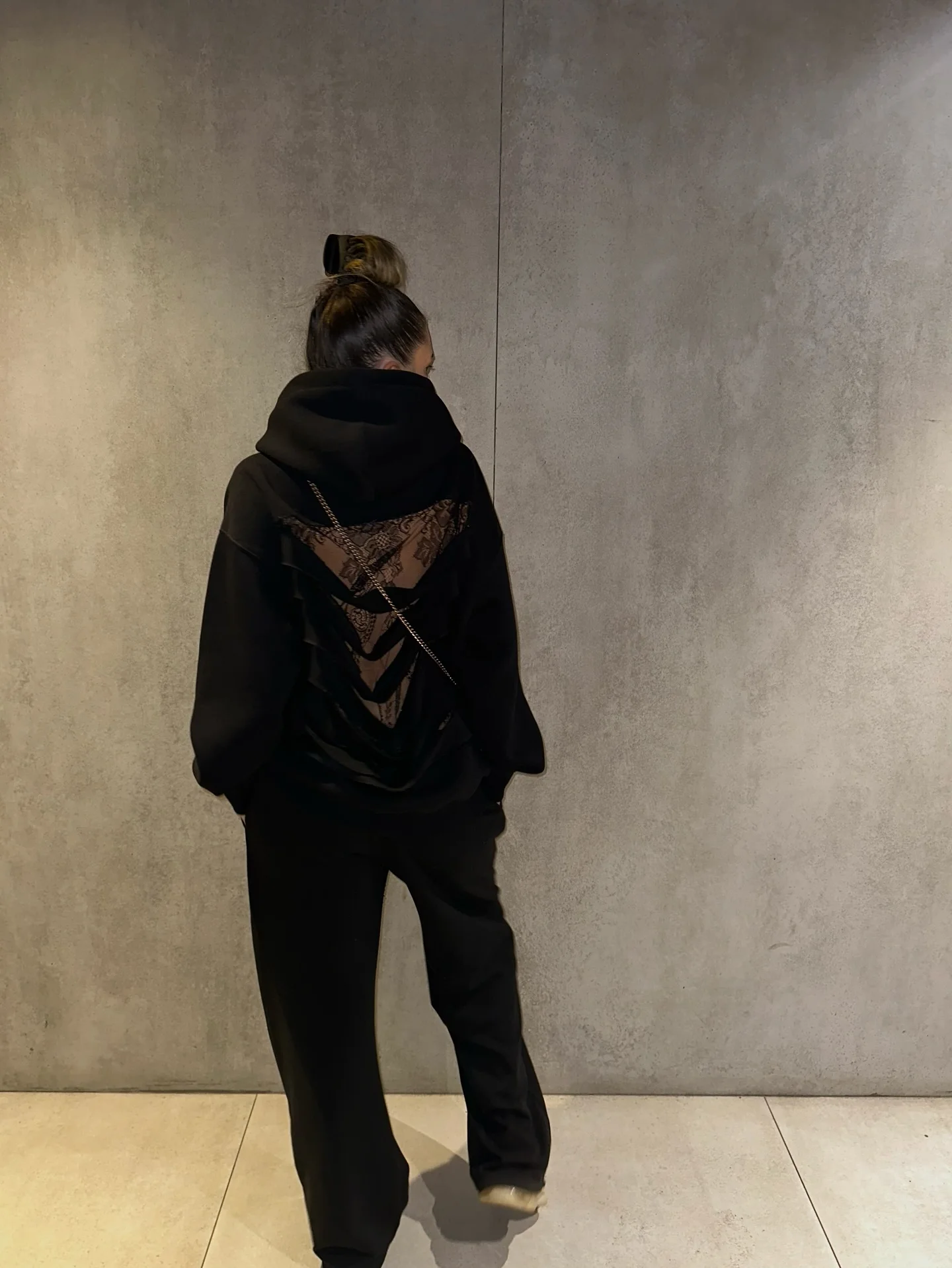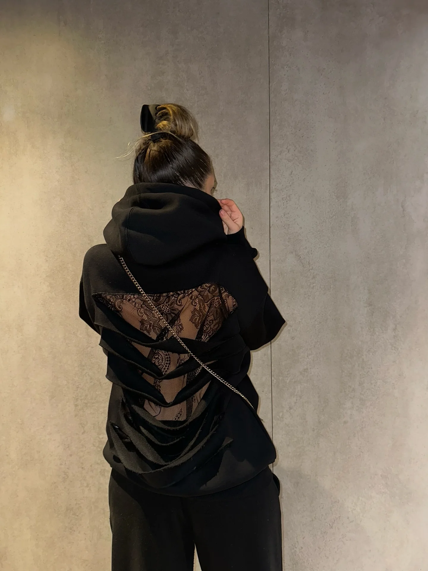 American Y2K Harajuku Gothic Lace Back Hollow Hoodie Womens Black Loose Pullover Hoodie Fashion Translucent Jacket