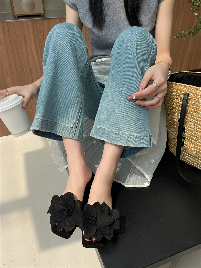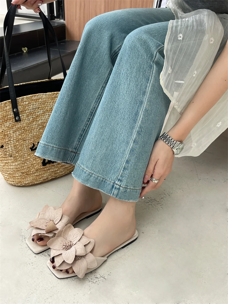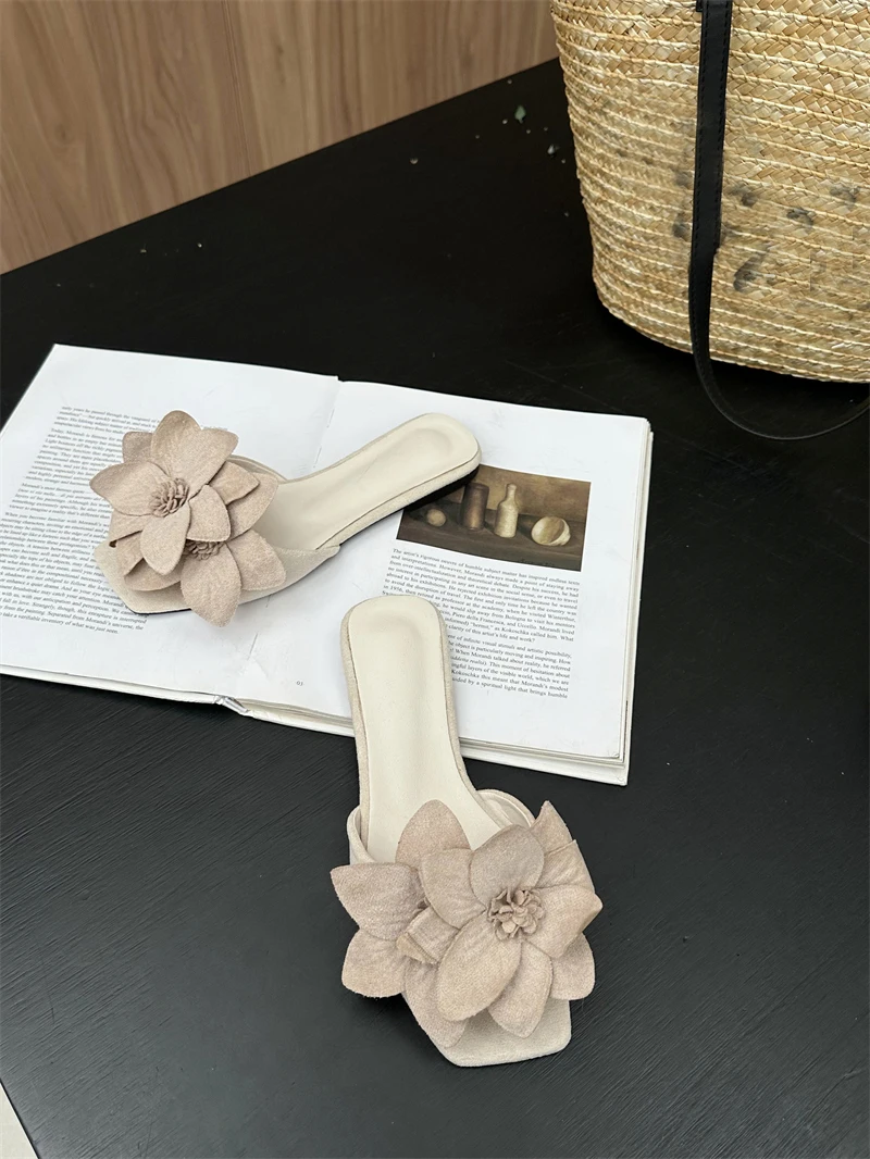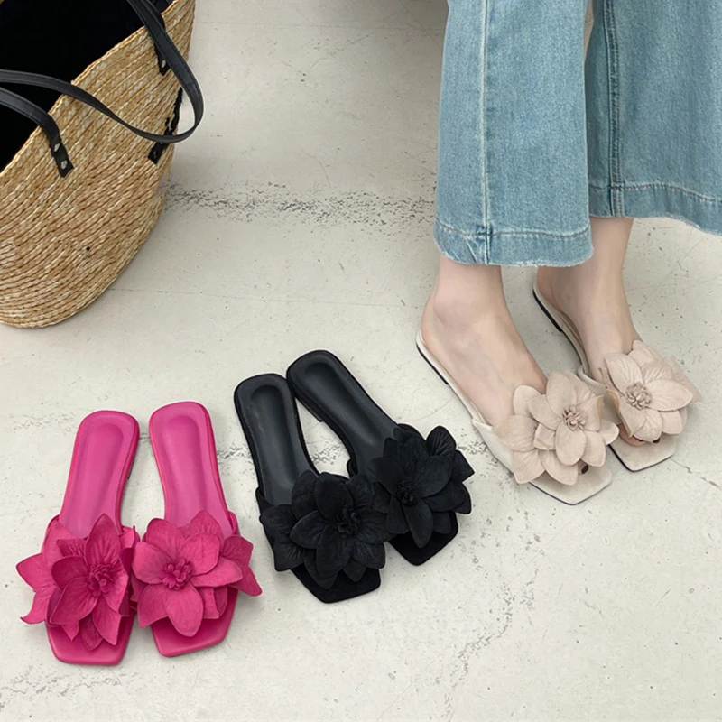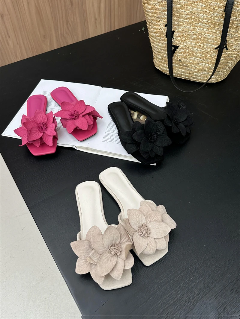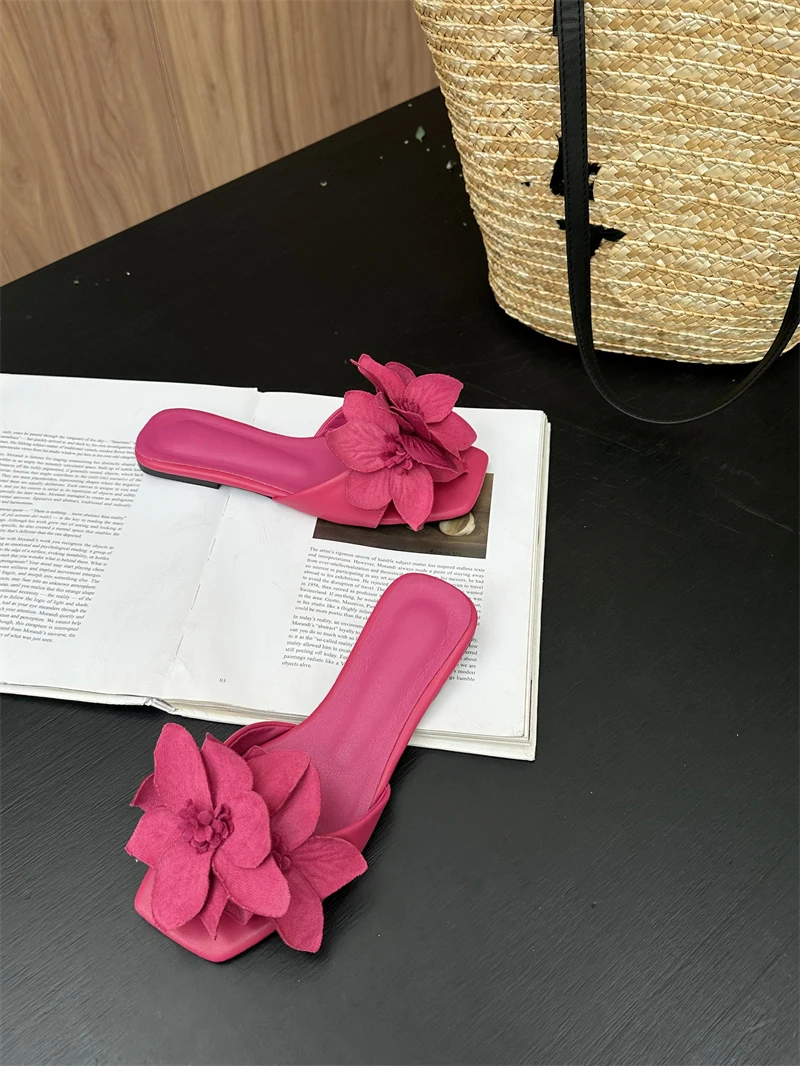 Aneikeh Rose Red Women PU Outdoor Anti Slip Sandals Simple Leisure Shallow Fashion Flower Square Toe Flats Slippers 2023 Summer