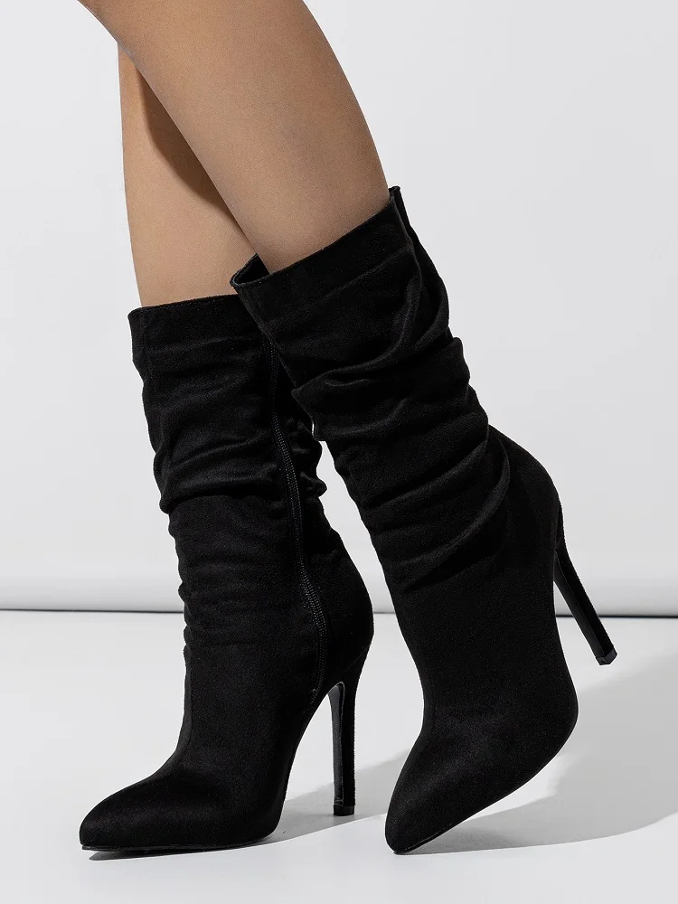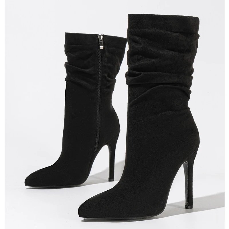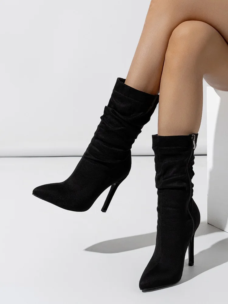 Aneikeh Wedding Pleated Flock Fashion Solid Platform Zipper Boots Women Winter Fashion Pointed Toe Thin High Heel Short Botas