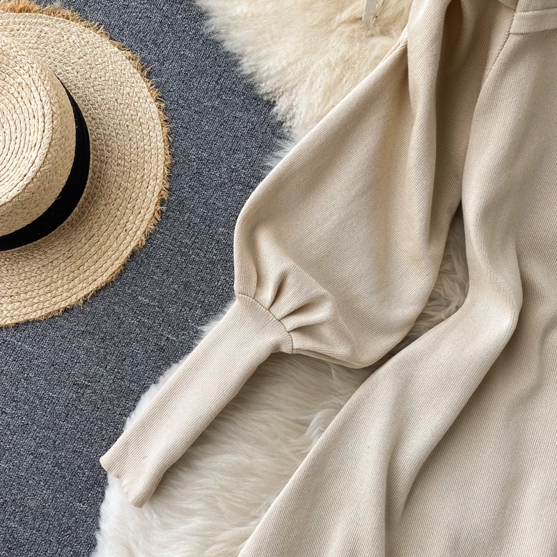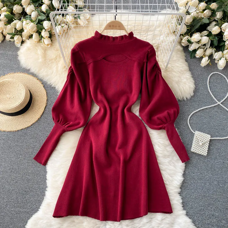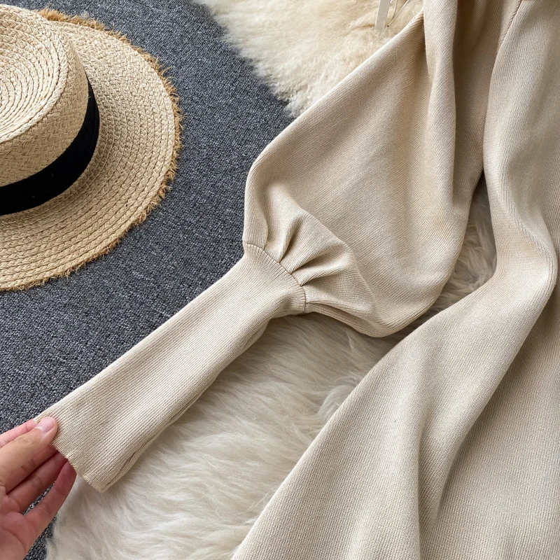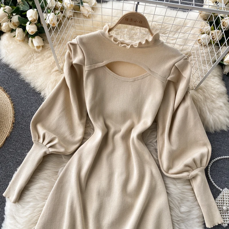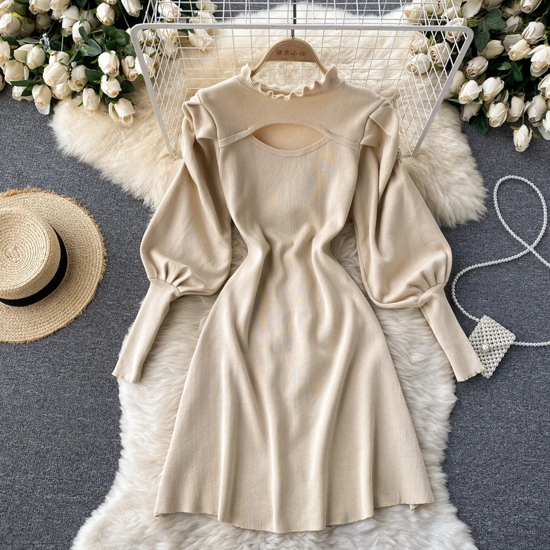 ANSZKTN Spring Autumn ANSZKTN Korean Version Of The French Design Hollow Lantern Sleeve Knitted Casual Dresses Women