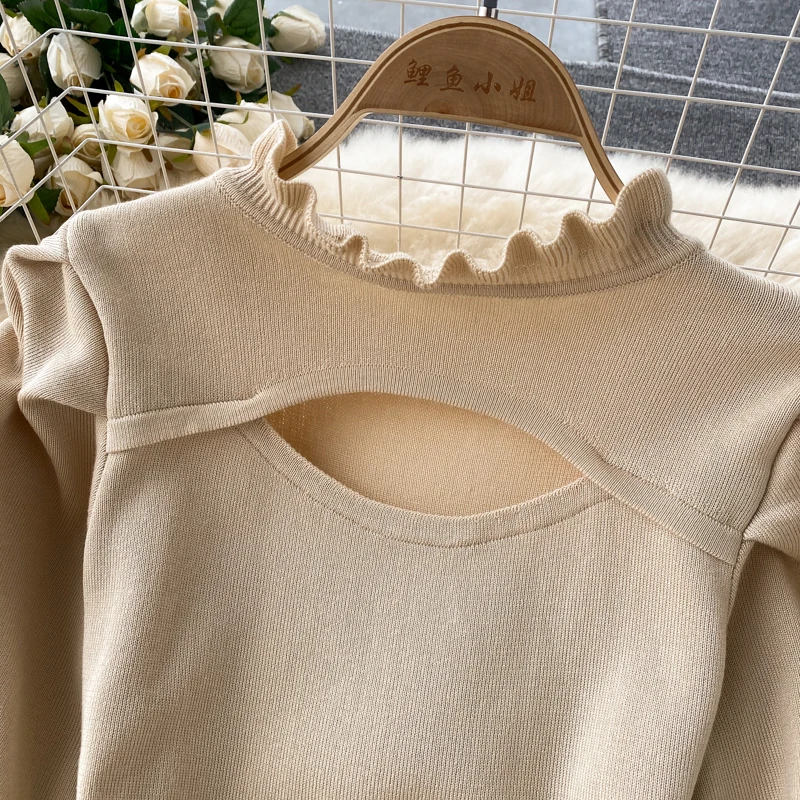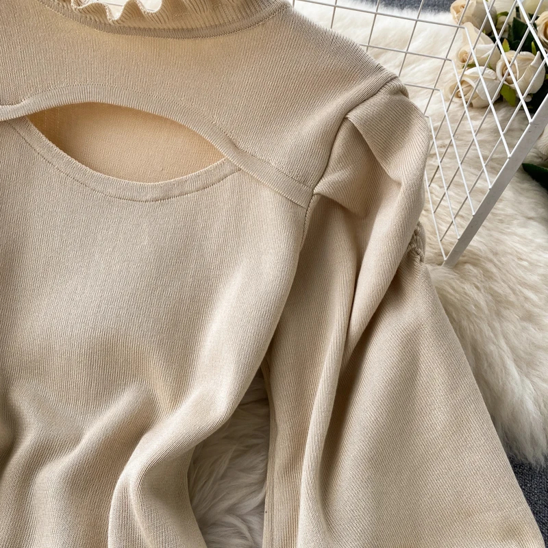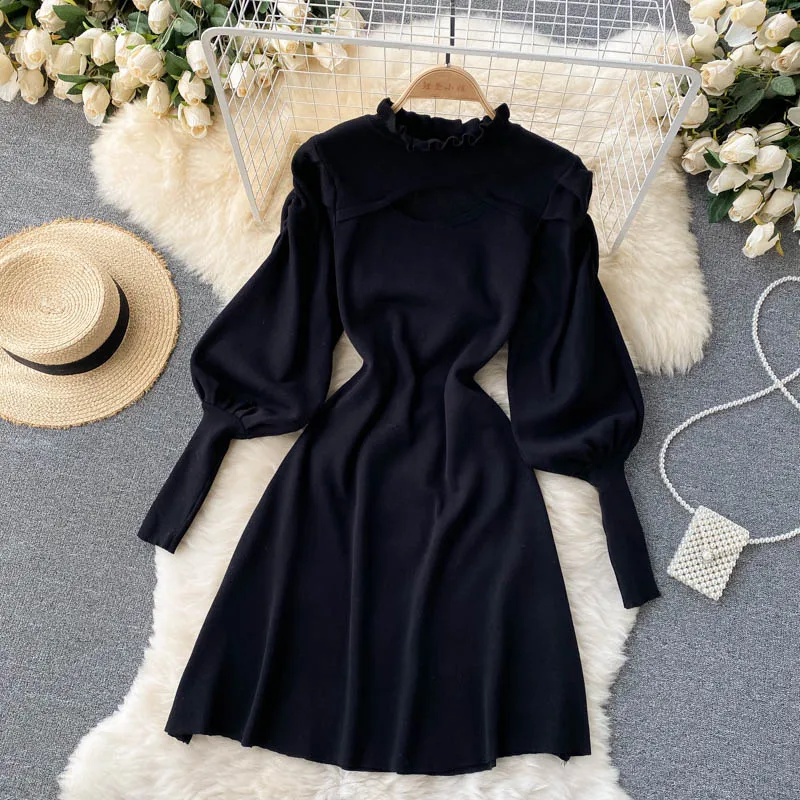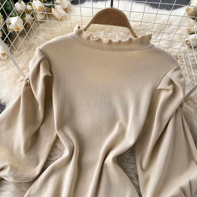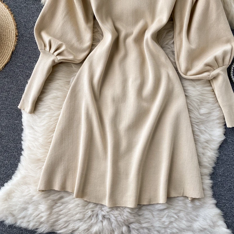 ANSZKTN Spring Autumn ANSZKTN Korean Version Of The French Design Hollow Lantern Sleeve Knitted Casual Dresses Women