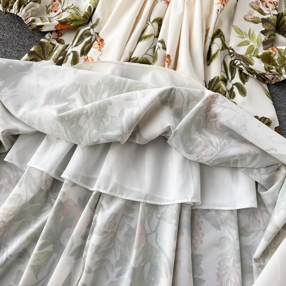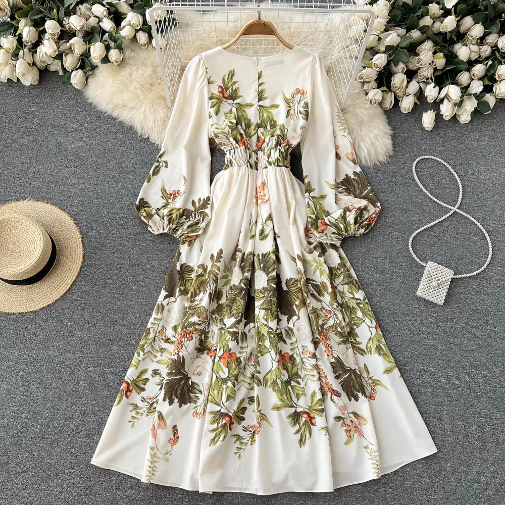 Spring New V -Neck French Retro Floral Long -Sleeved Casual Women'S Dress