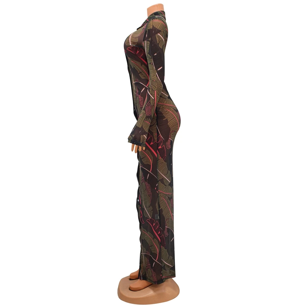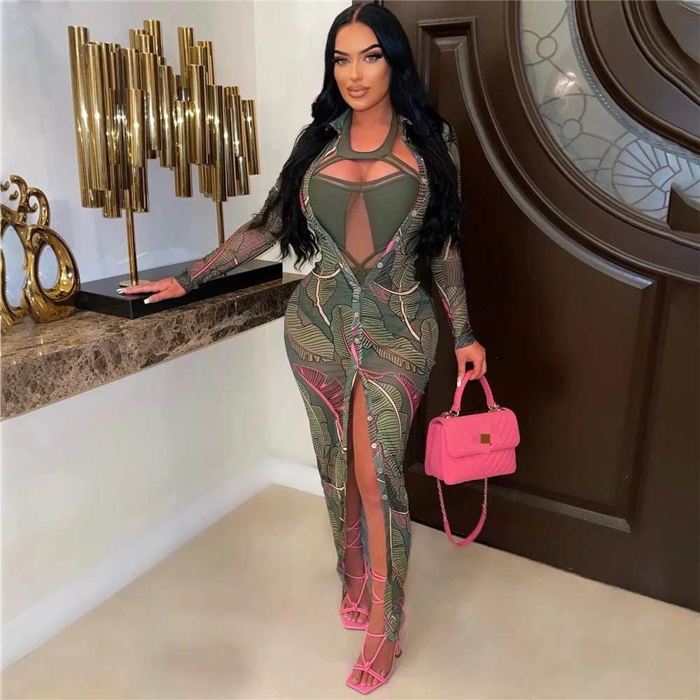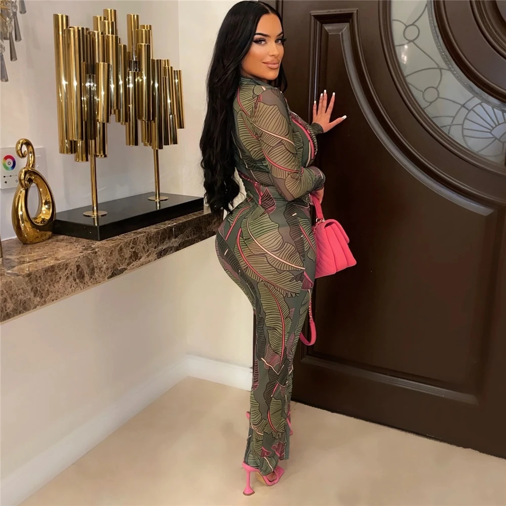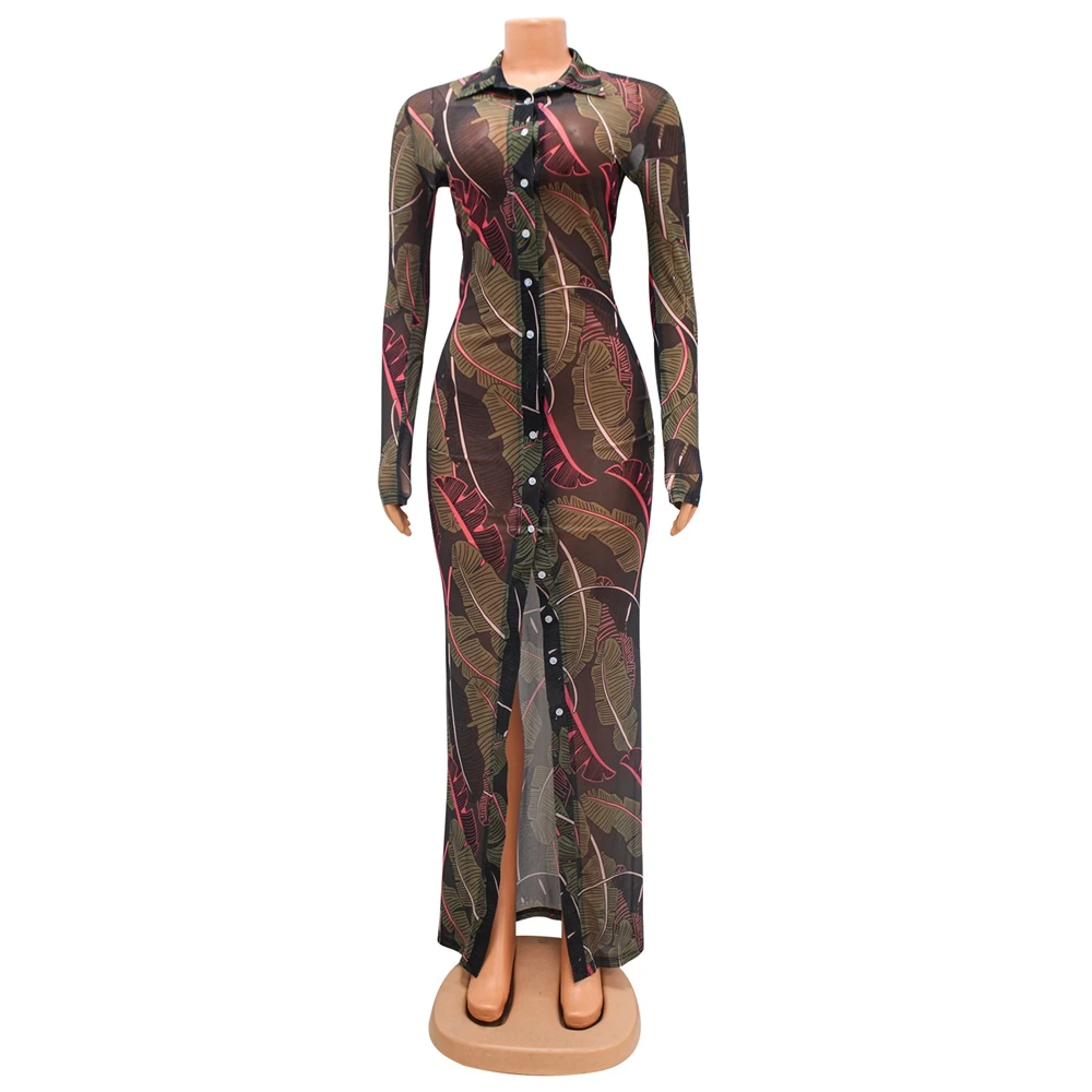 ANSZKTN Women spring Fashion Women's sexy mesh see through print perspective long-sleeved long dress