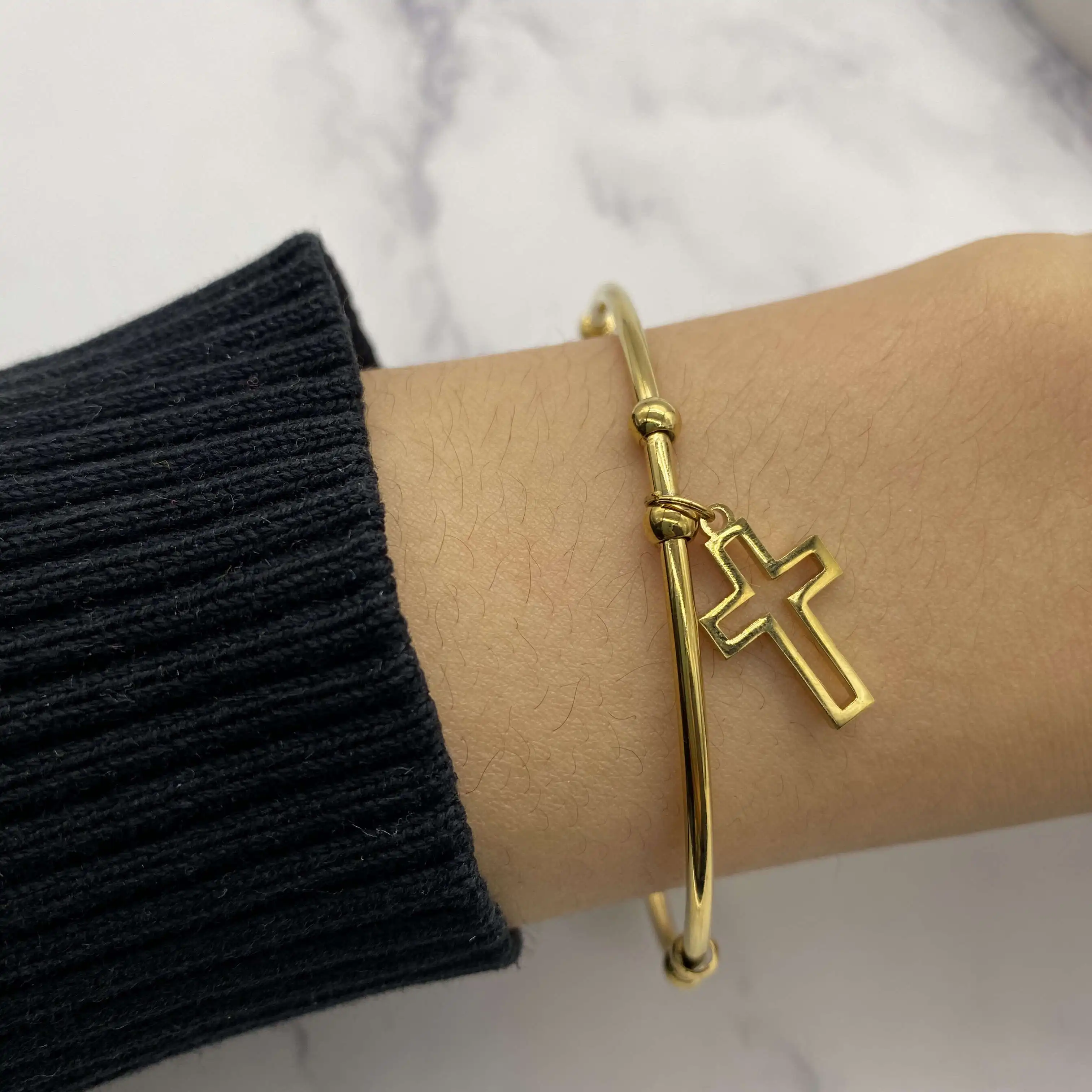 Antique Stainless Steel Crucifix Cross Charm Bangle Bracelet High Quality Vacuum Plating Christian Hollow Cross Cuff Bangle