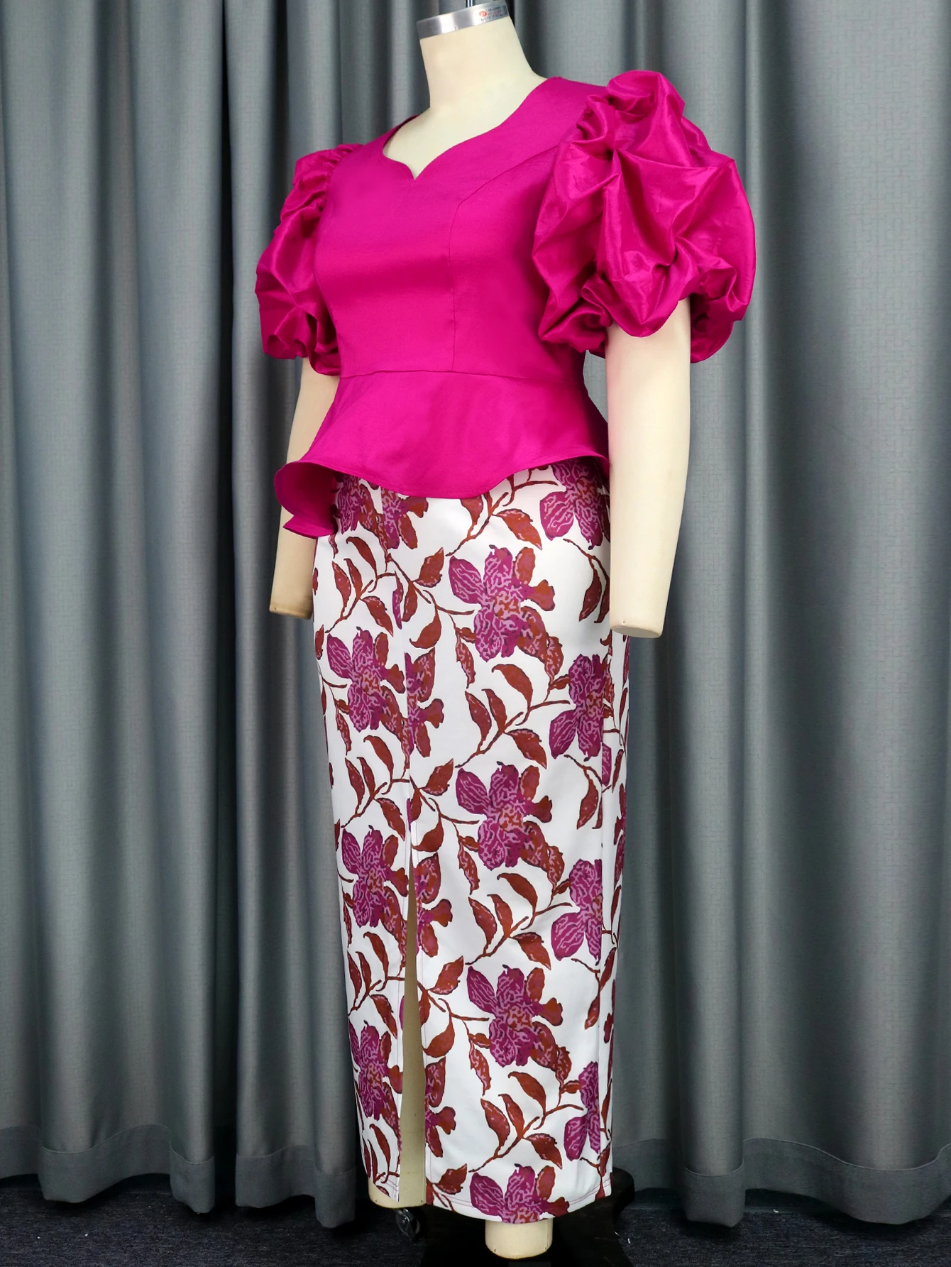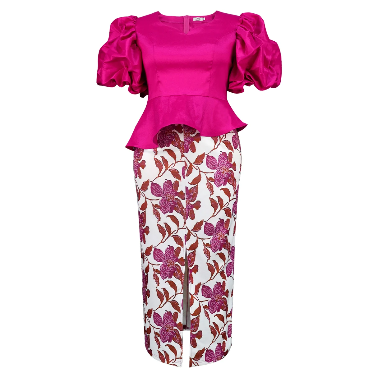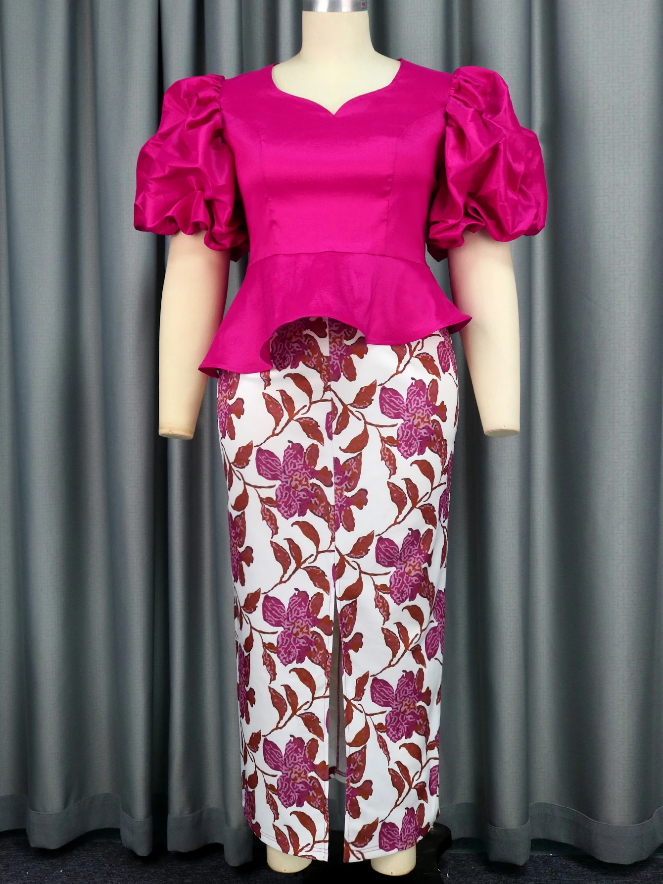 AOMEI Printed Slit Skirt Irregular Peplum Tops Office Lady 2 Pieces Set