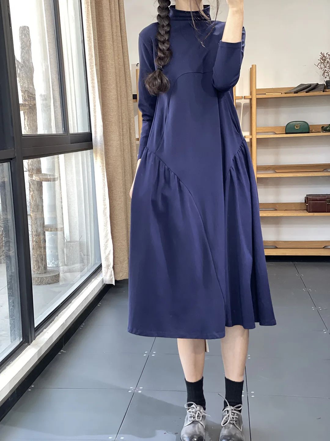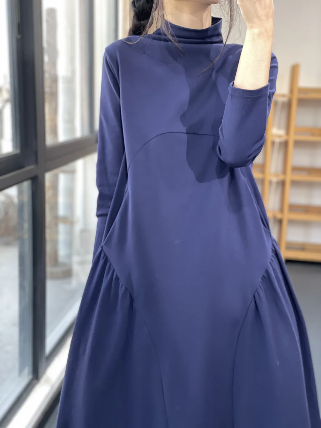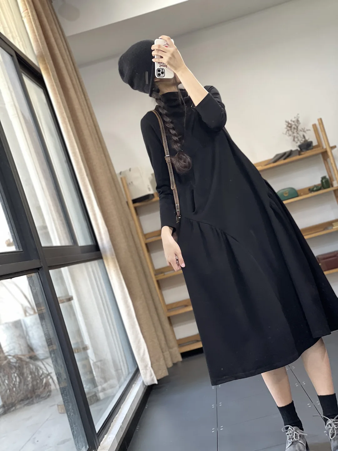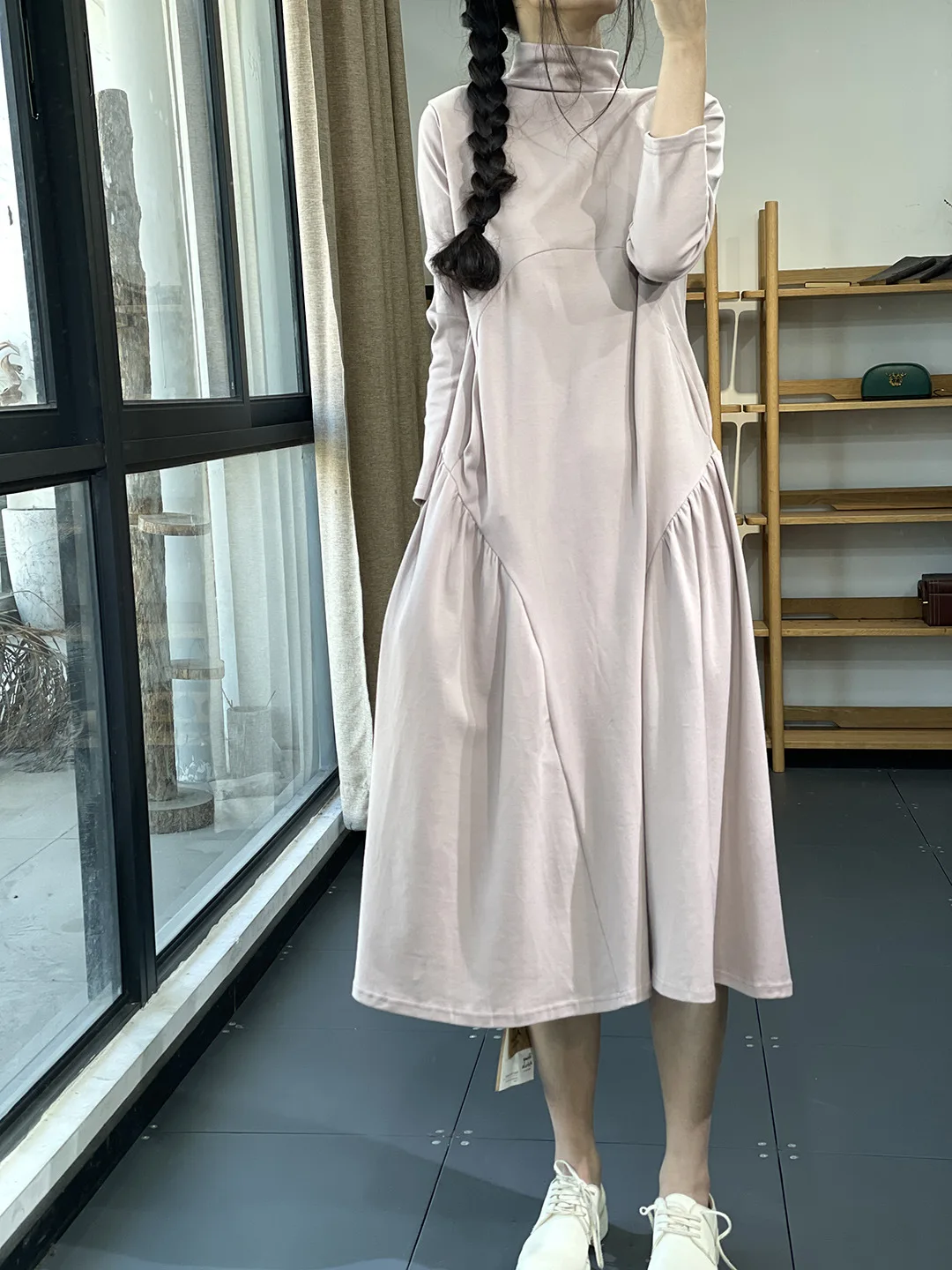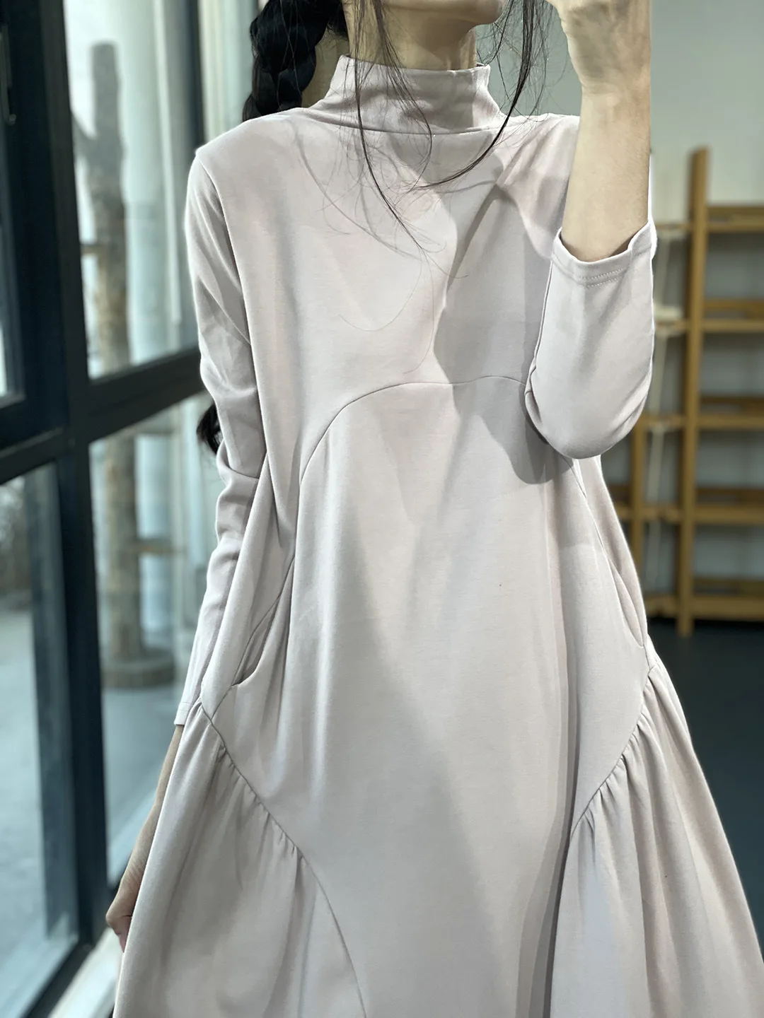 Artistic Loose Cos Style Dress Stitching Ruffle Half Turtleneck Solid Color Knitted T-shirt Dress 2022 Autumn New Women's