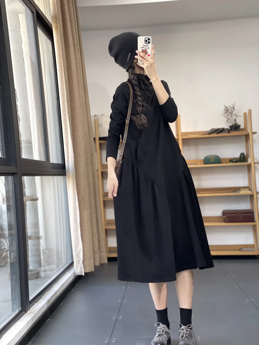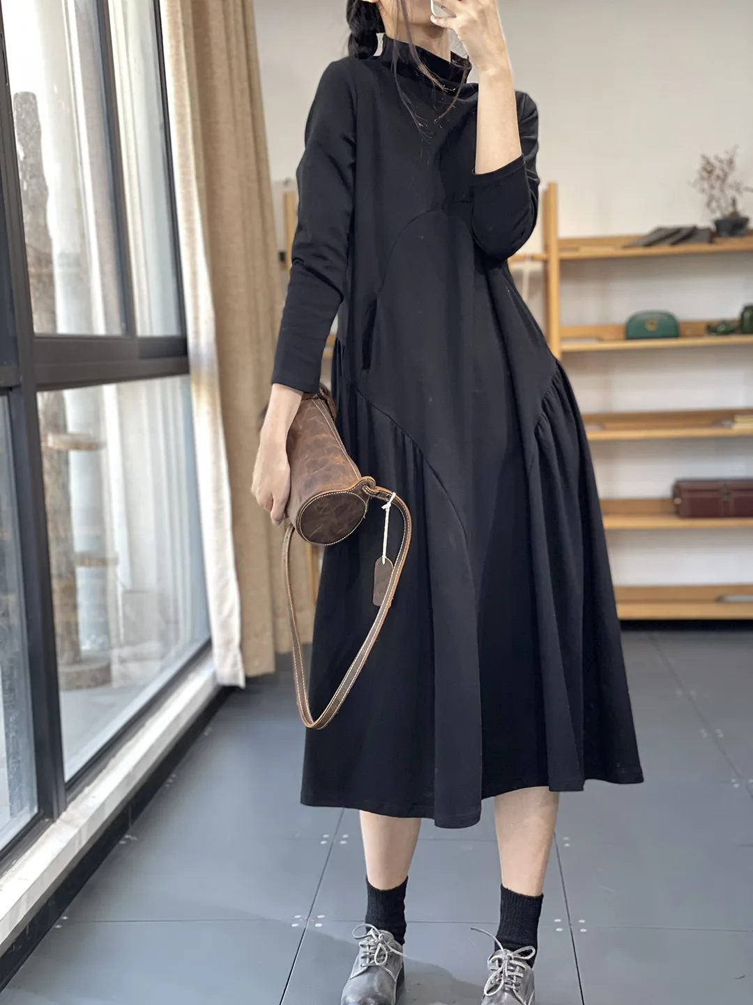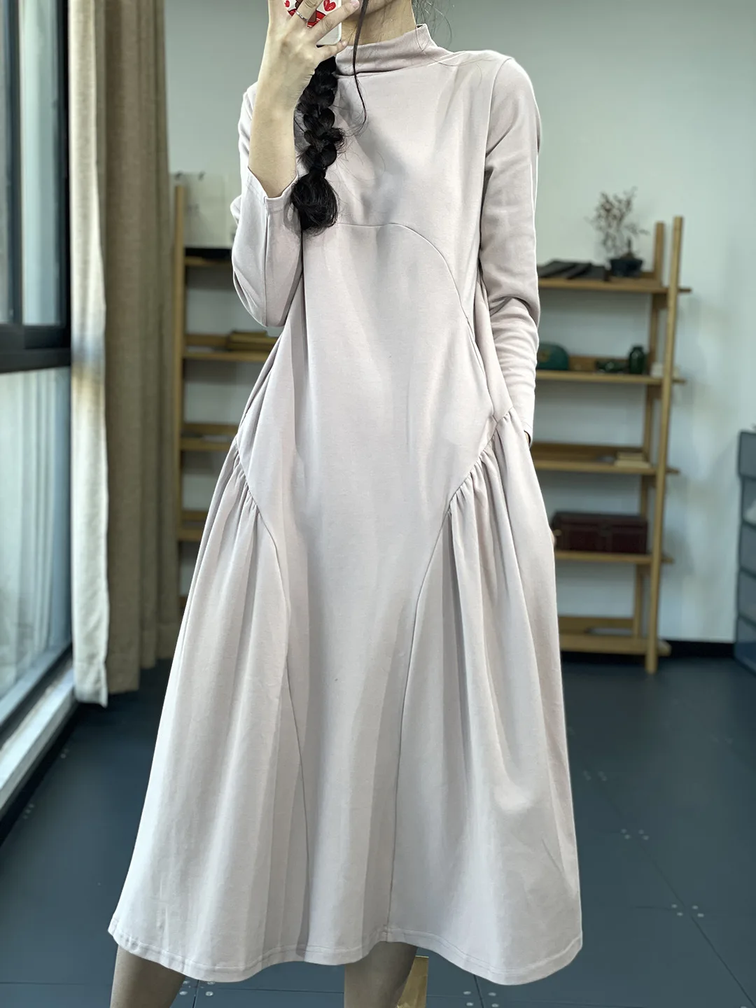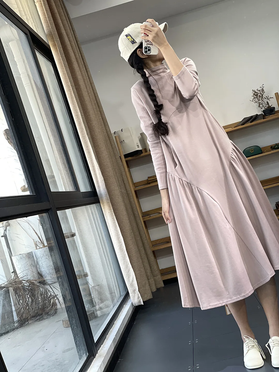 Artistic Loose Cos Style Dress Stitching Ruffle Half Turtleneck Solid Color Knitted T-shirt Dress 2022 Autumn New Women's