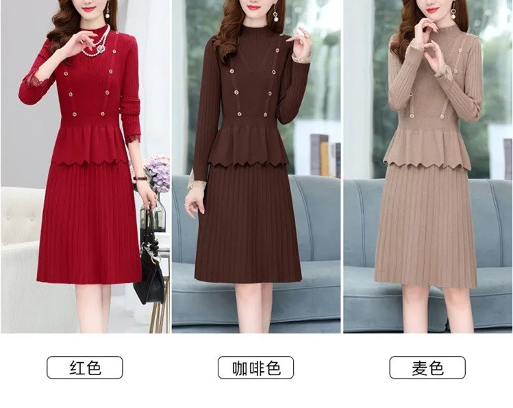 Autumn and winter high quality selling solid color round collar button design high waist in the long two-piece A-line dress