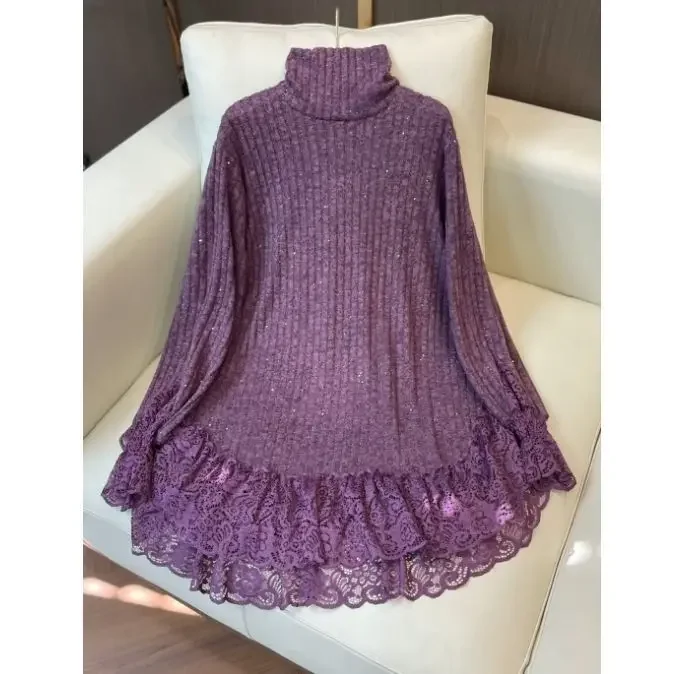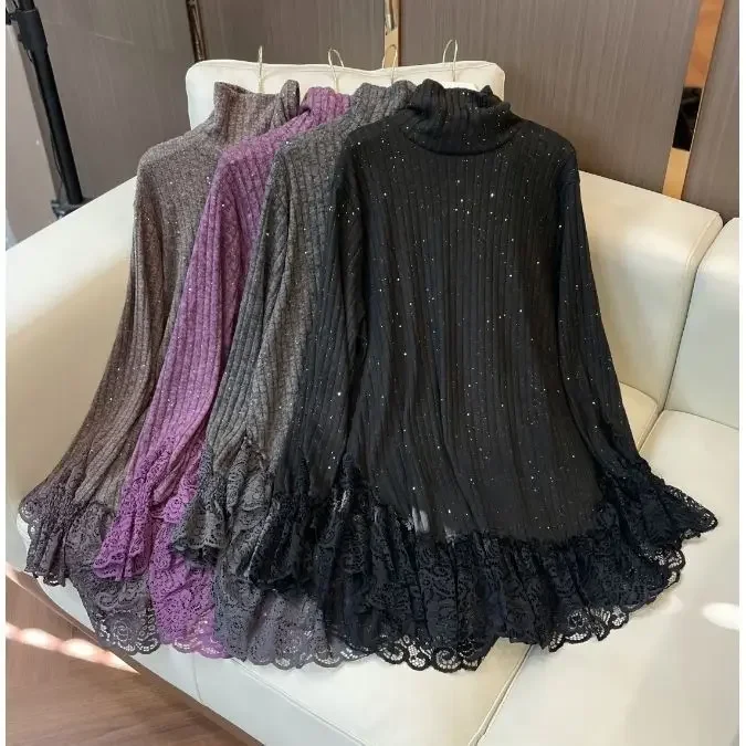 Autumn and Winter New Fashionable Style Lace Splicing Bottom Shirt Thin Solid Color Loose Look Casual Loose Long Sleeves Top