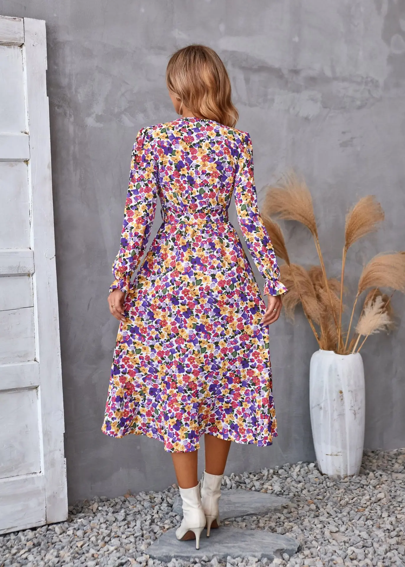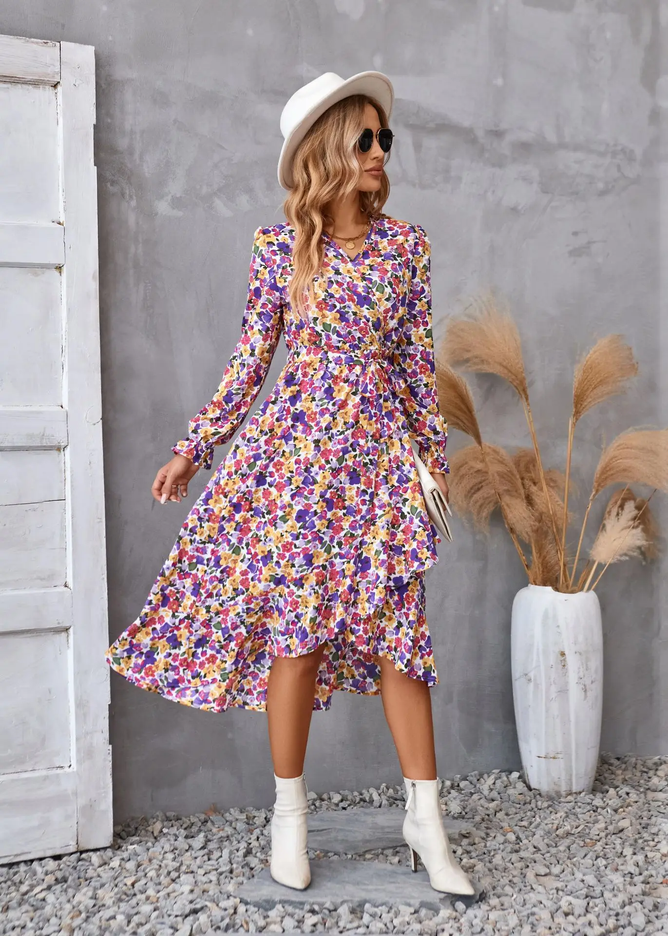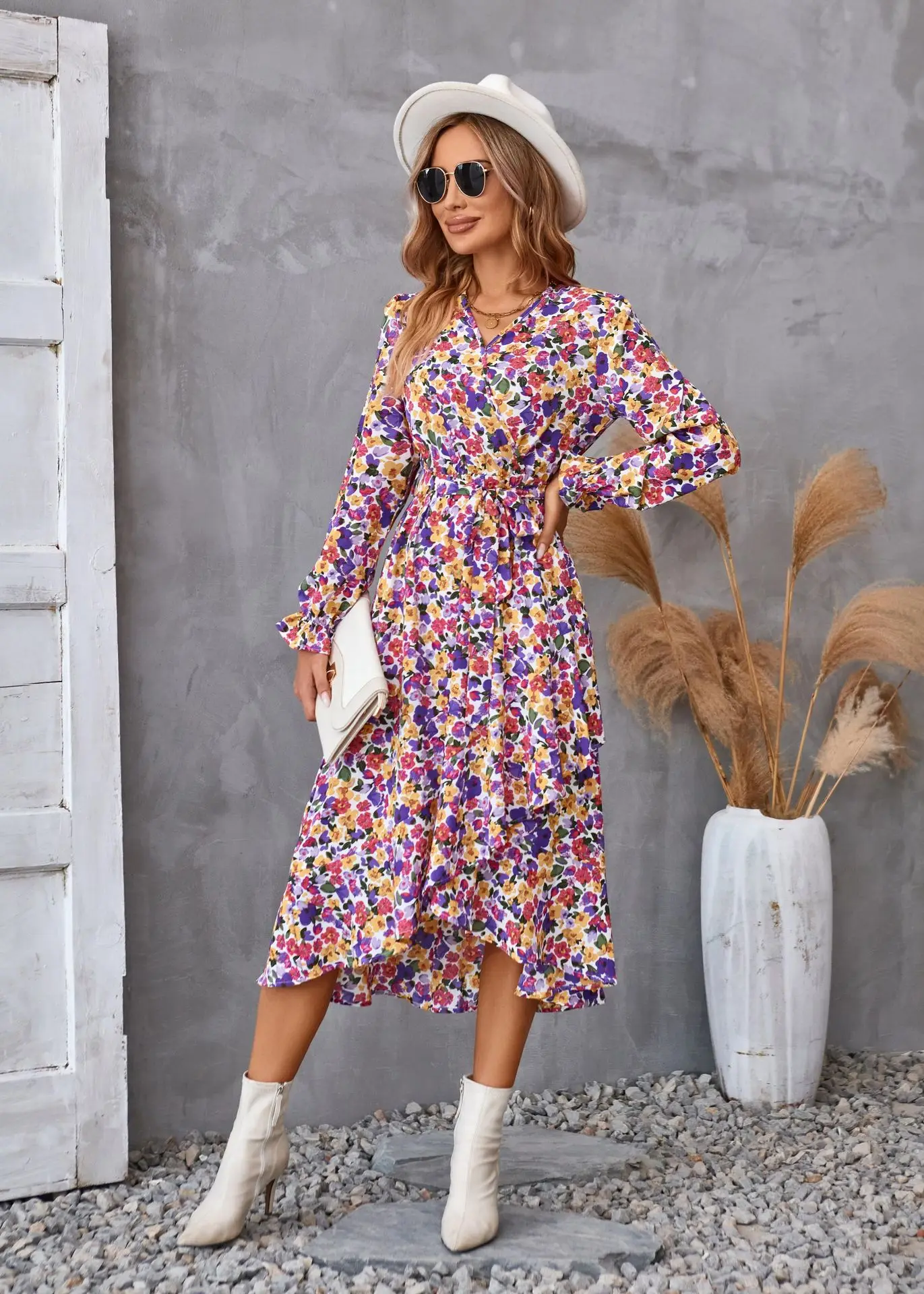 Autumn and Winter Printed V-neck Long-sleeved dress women's Commuting Temperament Lace-up Women's dress