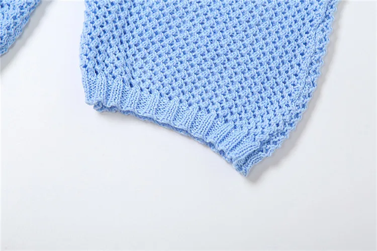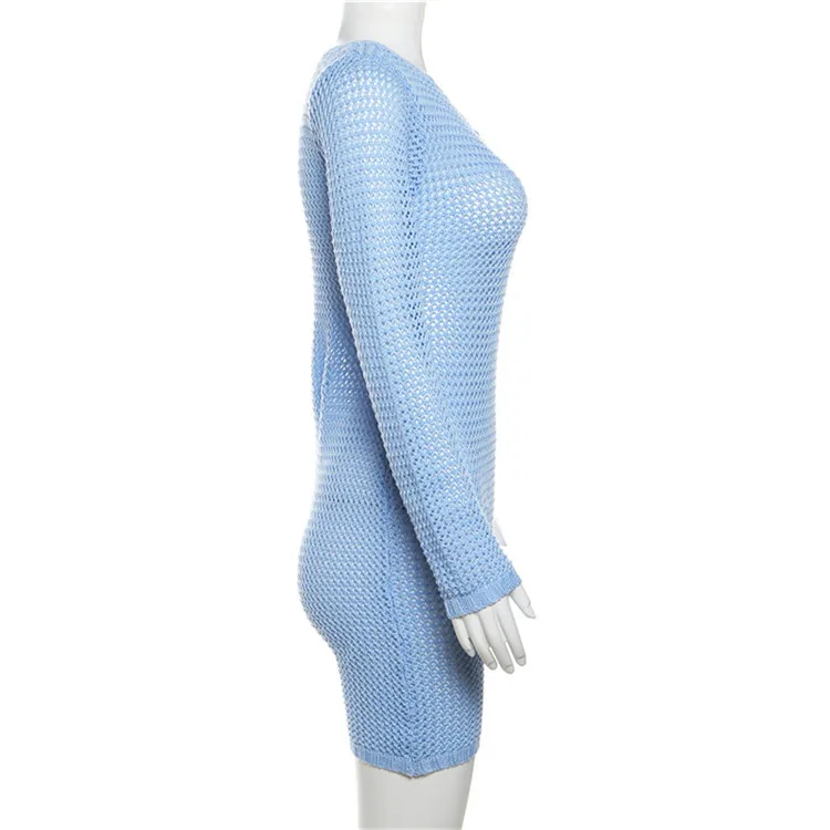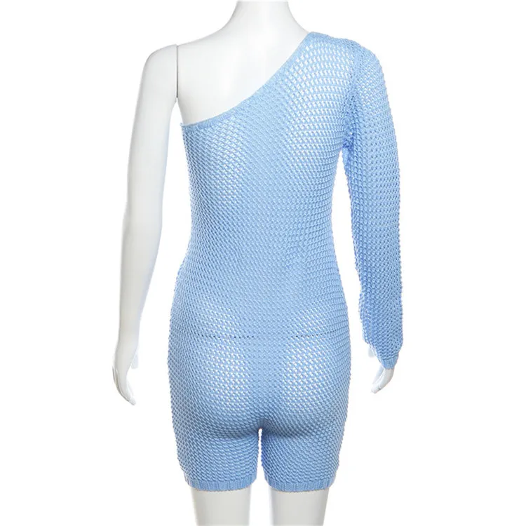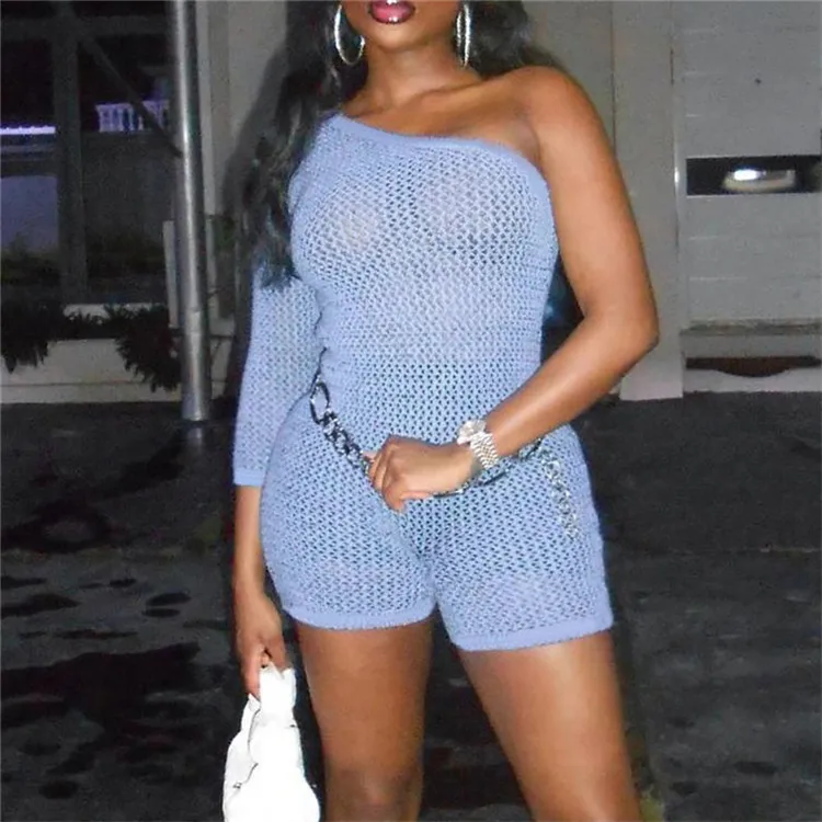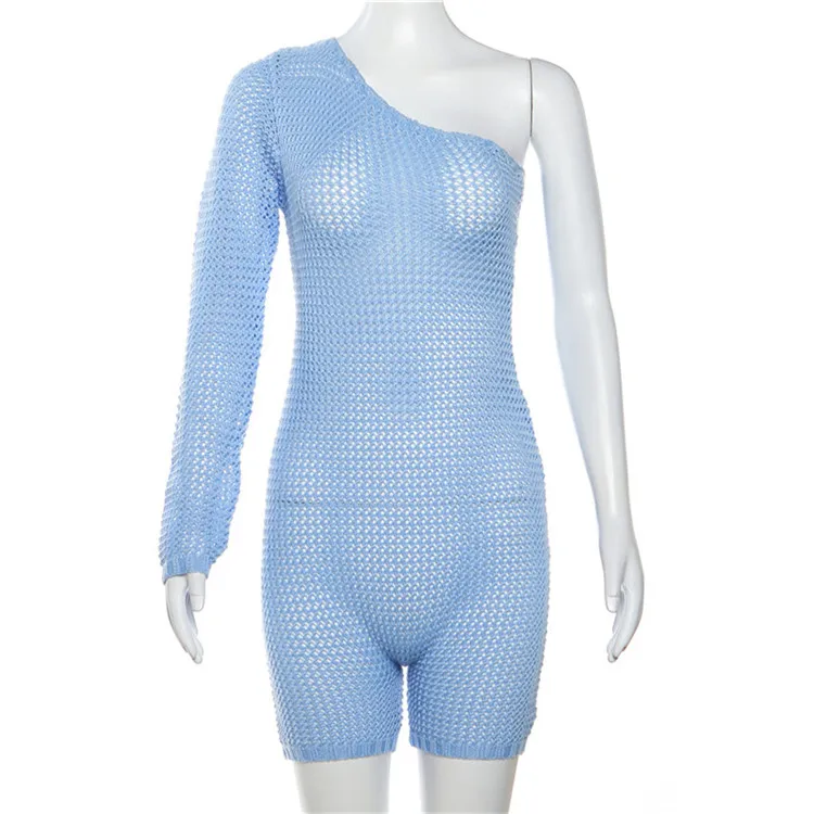 Autumn Blue Knitted One Shoulder Rompers Beach Party For Women 2023 Bodycon See Through Asymmetry Sexy Body Rompers