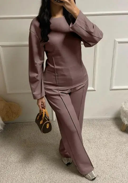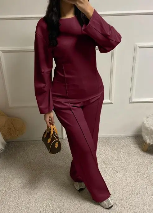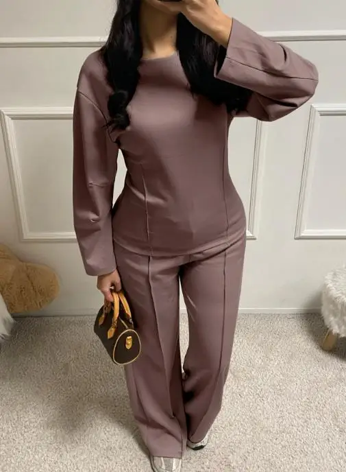 Autumn casual loose 2-piece set of solid color round neck pit stripe spliced top and high waisted straight leg pants set