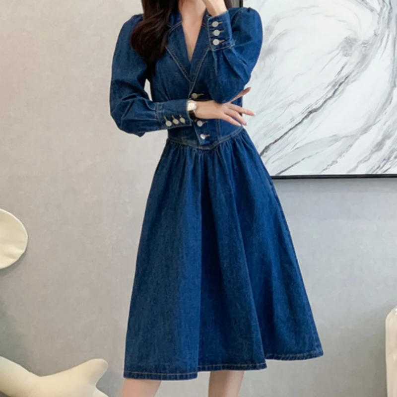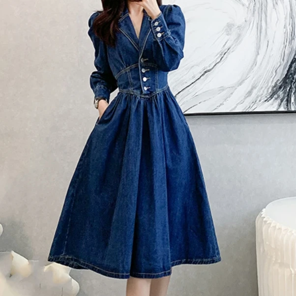 Autumn Elegant Temperament Retro Dark Blue High Denim Dress Popular Womens Fashion Clothes