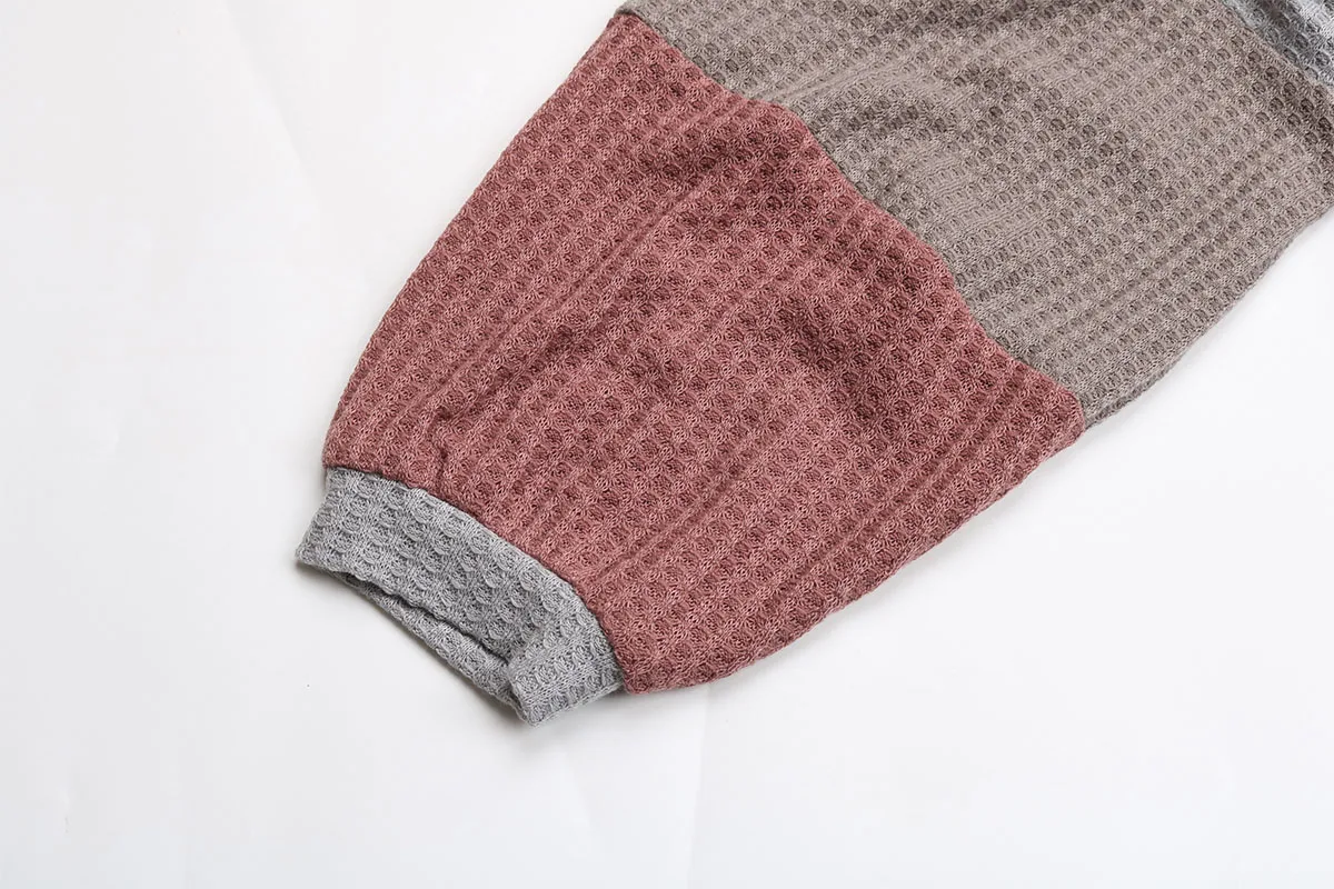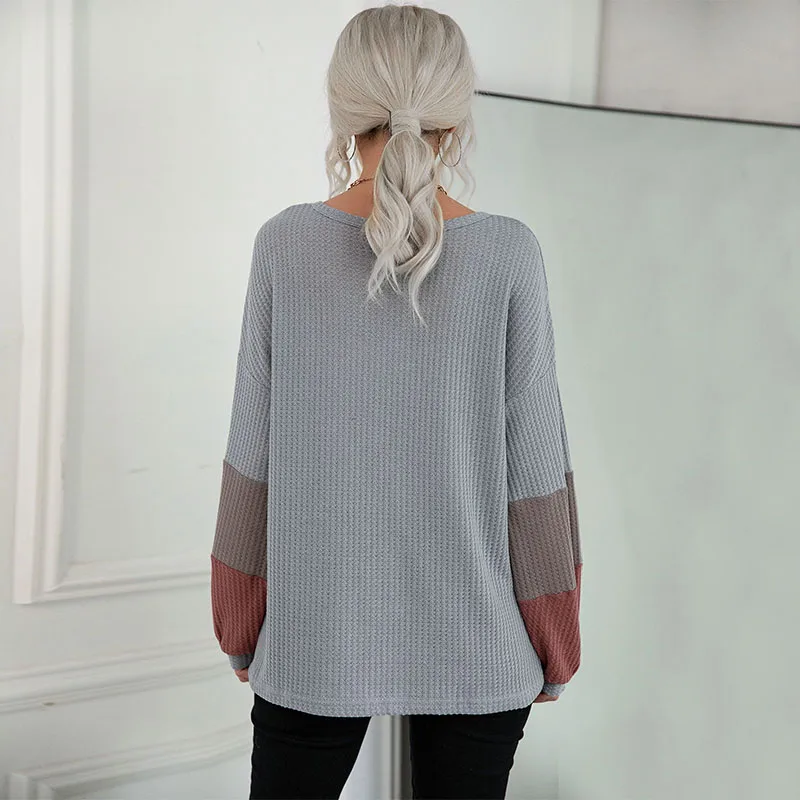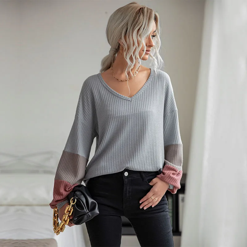 Autumn Knitwear Loose V Neck Walf Checks Casual Color-blocking Long Sleeve Shirt