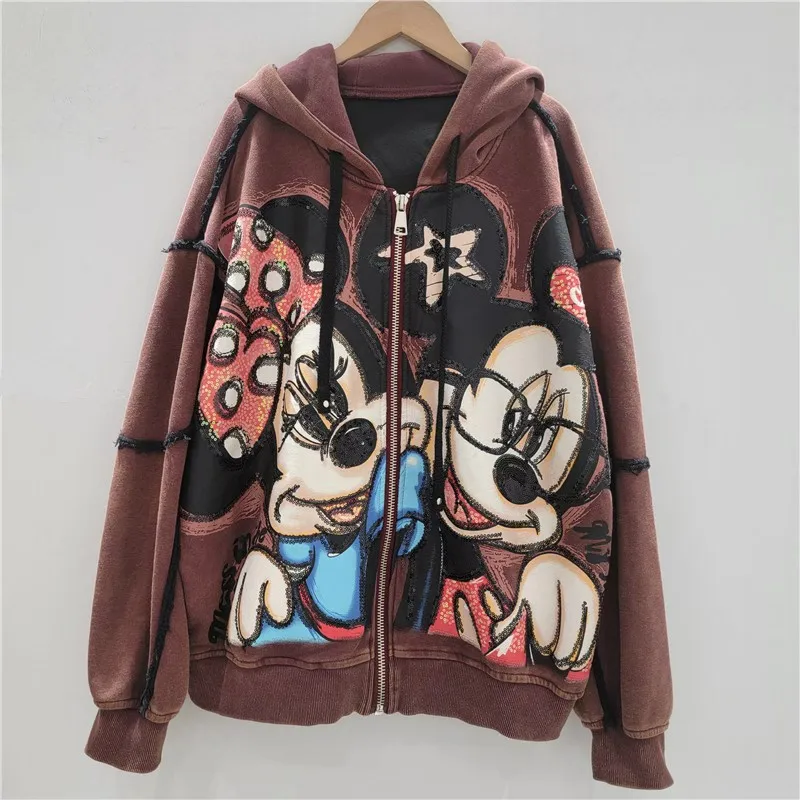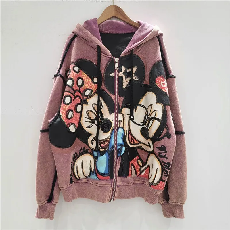 Autumn New Heavy Embroidery Cartoon Loose Coat Fashion Age-Reducing Hooded Jacket Zipper Long Sleeves Tie Top Outerwear Ladies