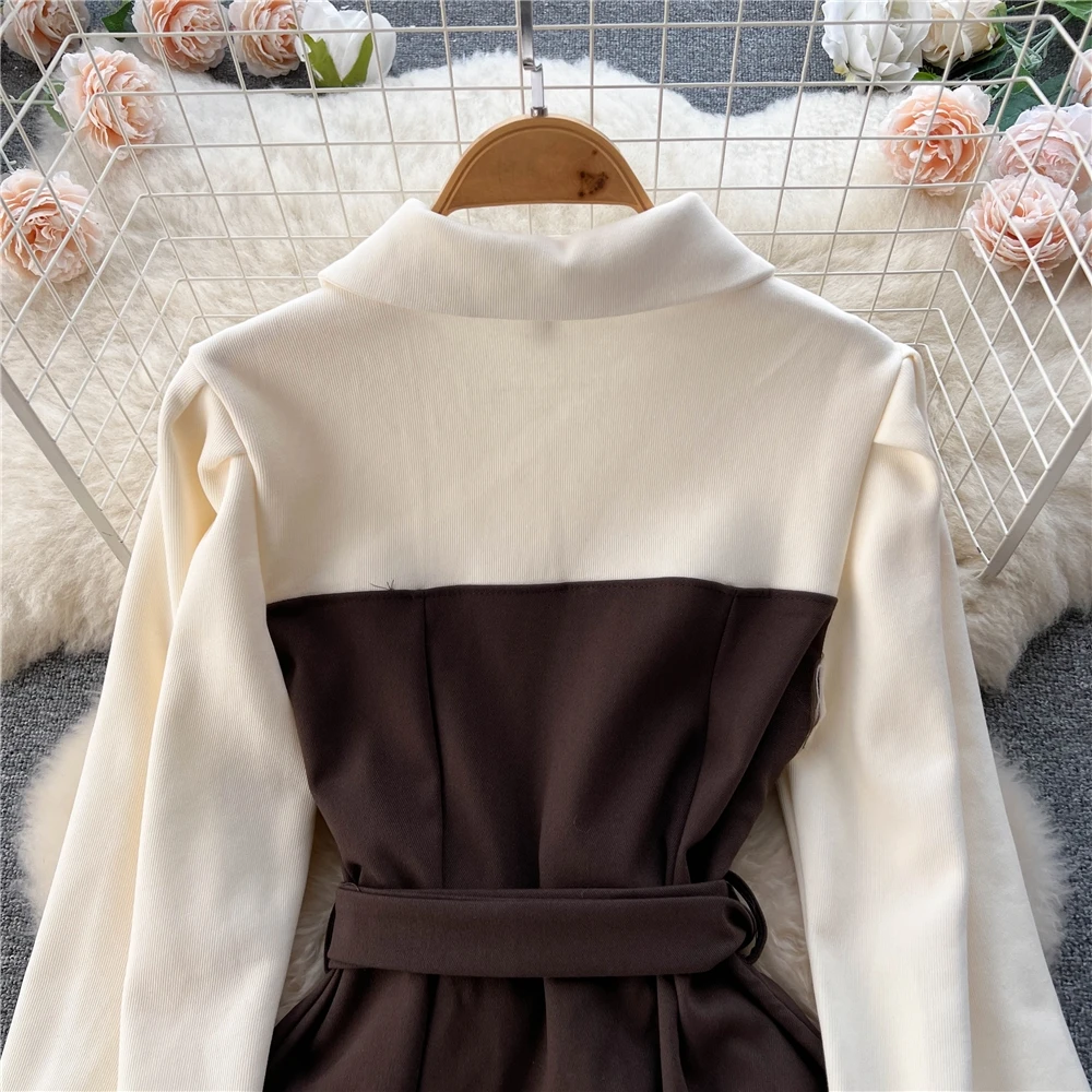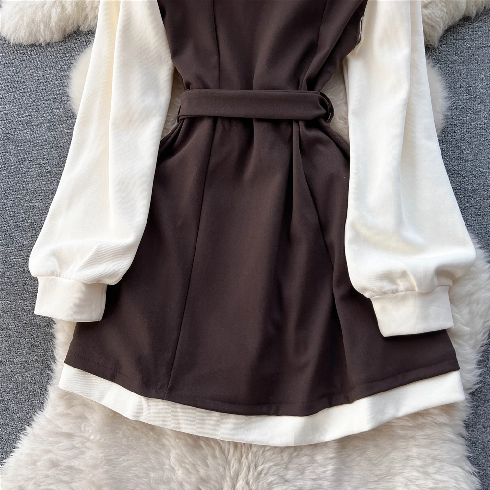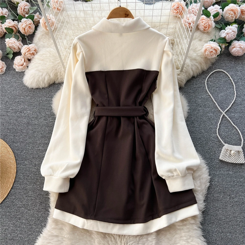 Autumn splicing against color to collect waist dress female French temperament small false two flounce edge A word skirt