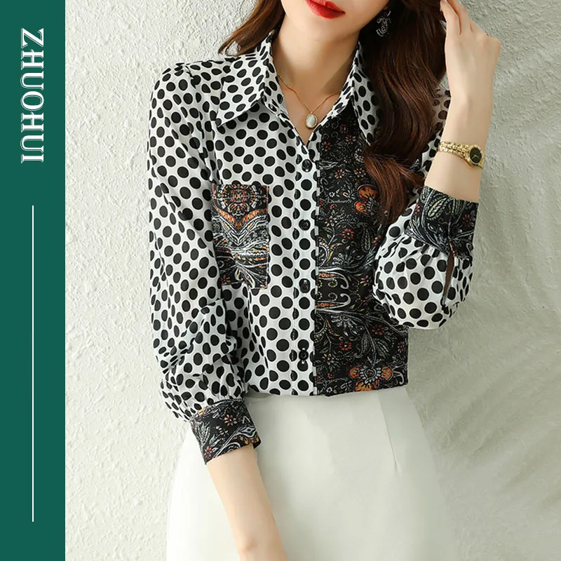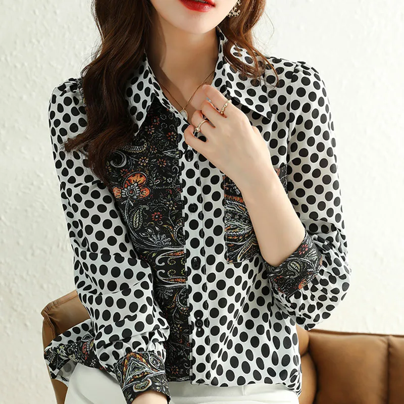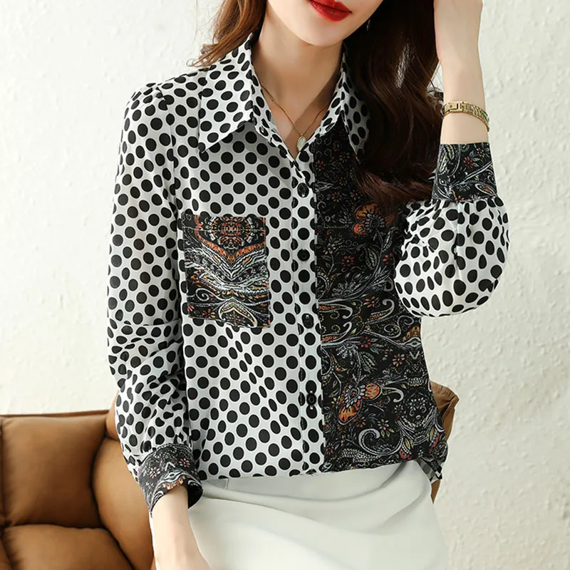Autumn Vintage Polo Patchwork Dot Print Blouse Shirt Pockets Trim Women Casual Collocation Shirts Ladies Clothes