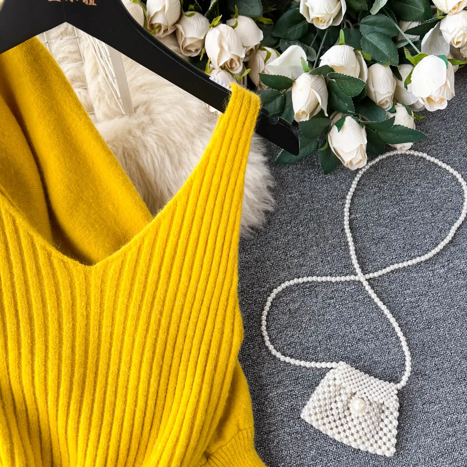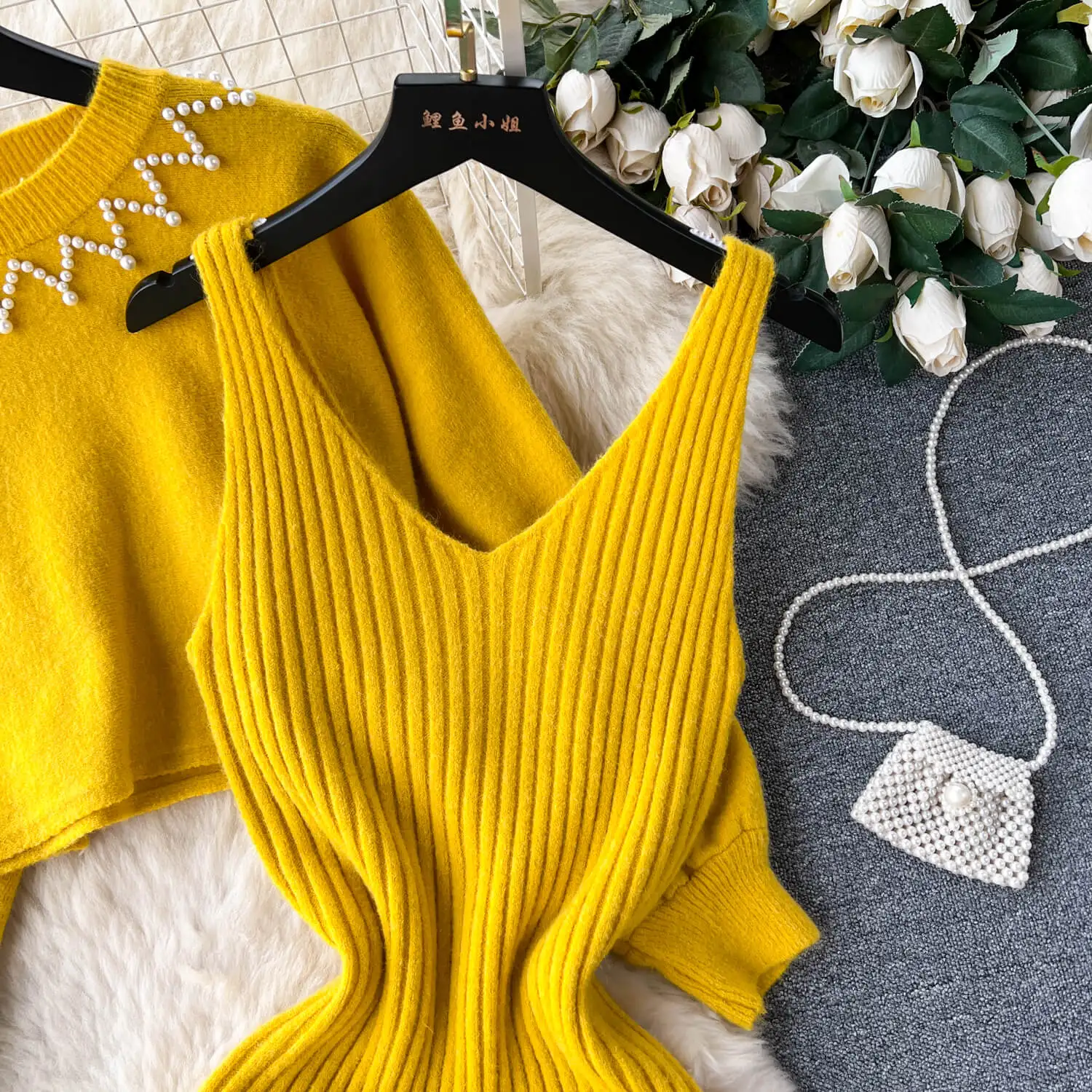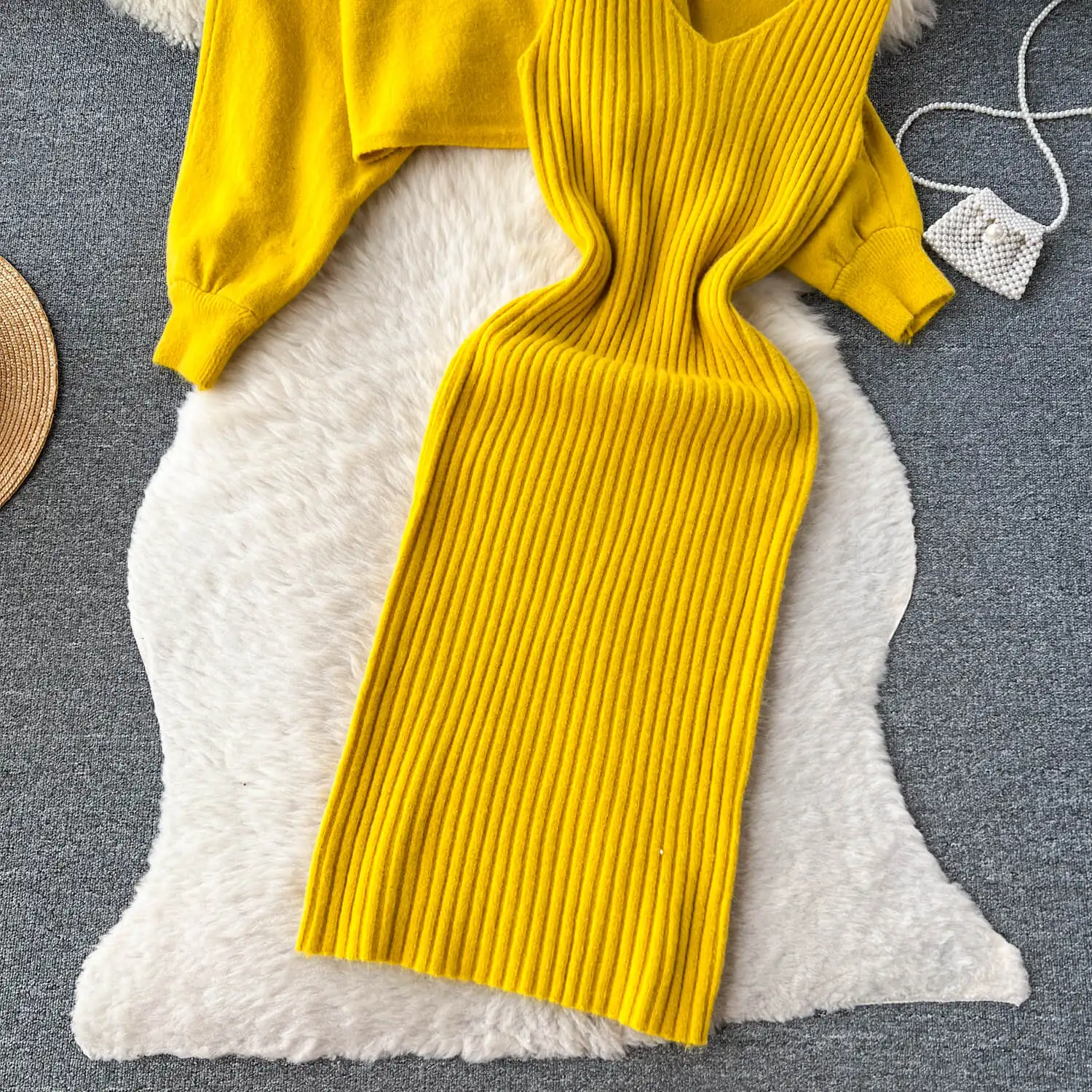 Autumn Winter High-Grade Loose Knit Round Neck Top + Halter Dress Two-Piece Set Women
