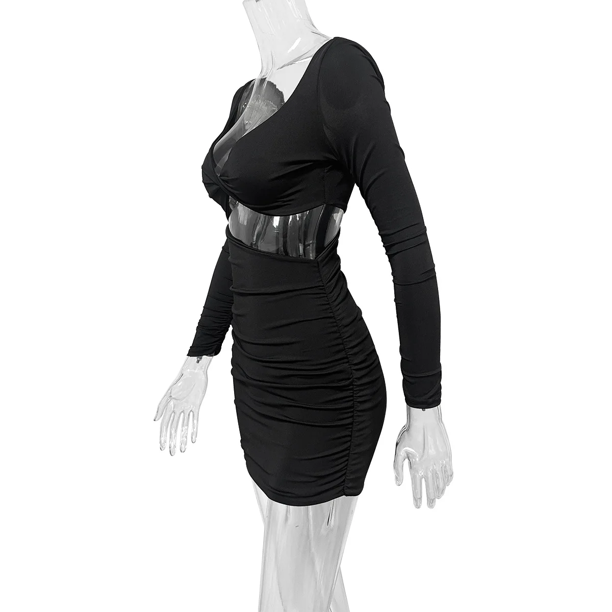 Autumn/winter long sleeved dress with low cut sexiness fashionable hollowed out pleats slim fit dress