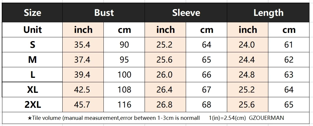 1.Please allow 1-3cm deviation due to manual measurement. 2.Measure the clothes you usually wear but not measure your body to choose size. 3.Choose the right size according to your own measurements combined with our size chart. Attention:Due to the effect of different monitors and cameras, the goods may look a little bit different from pictures shown online. GZOUERMAN |