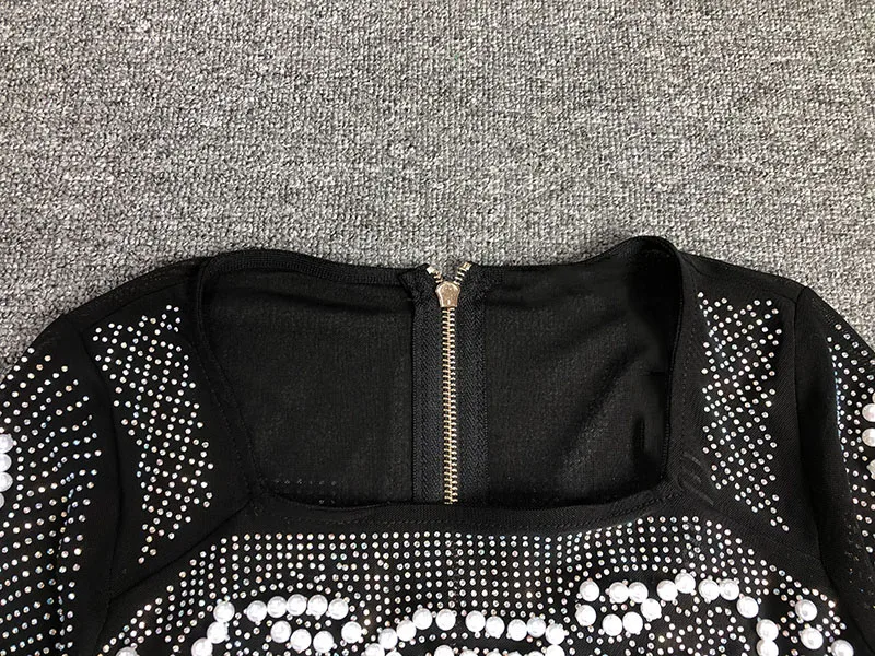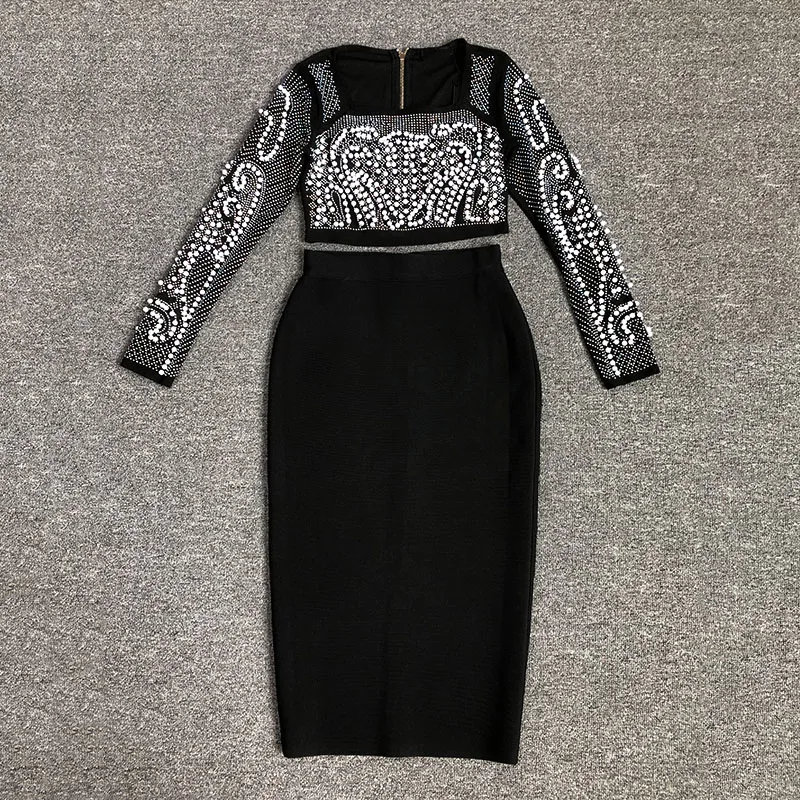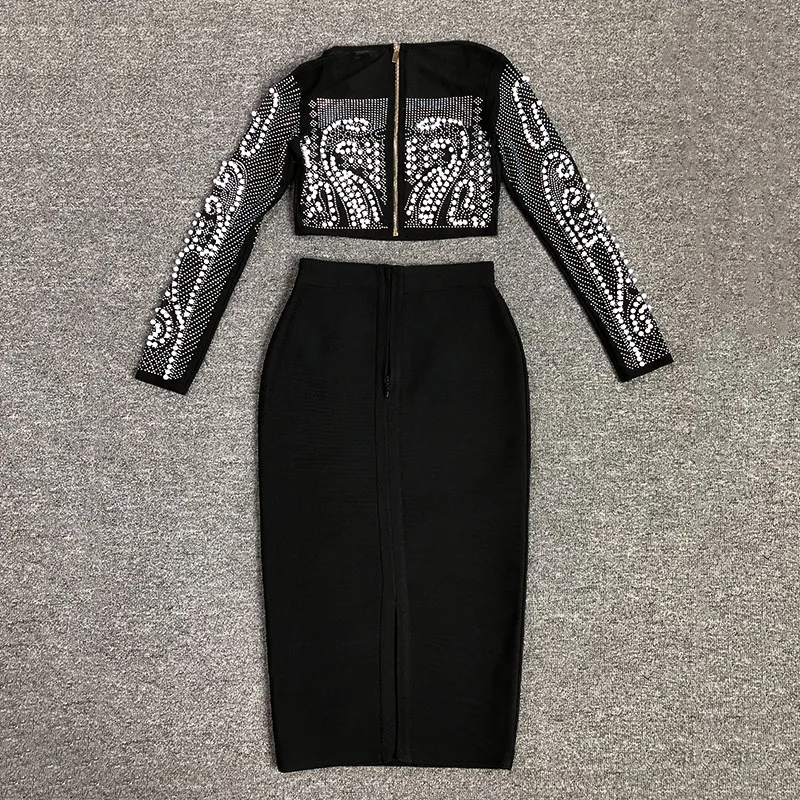 BA403 New Black Woman Suit Pearl Crystal Top Bandage Skirt Luxury Sexy Two Pieces Set Fashion Club Party Evening Dresses