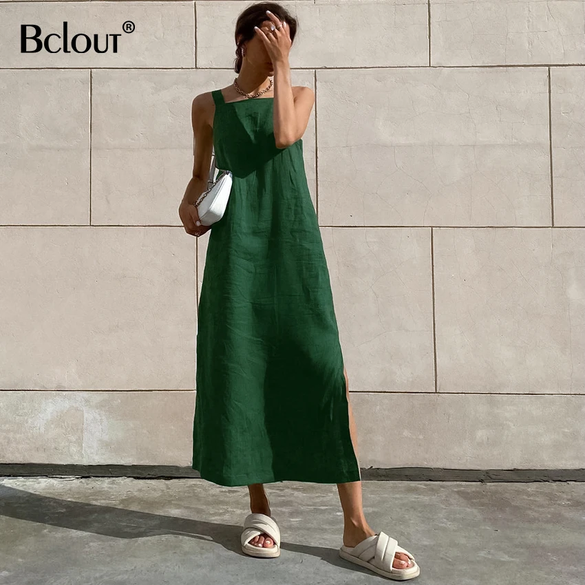 Bclout 2023 All-Match Midi Dress Vacation Style Lady Linen Sleeveless Straight Split Dress Summer Cotton Green Tank Dresses