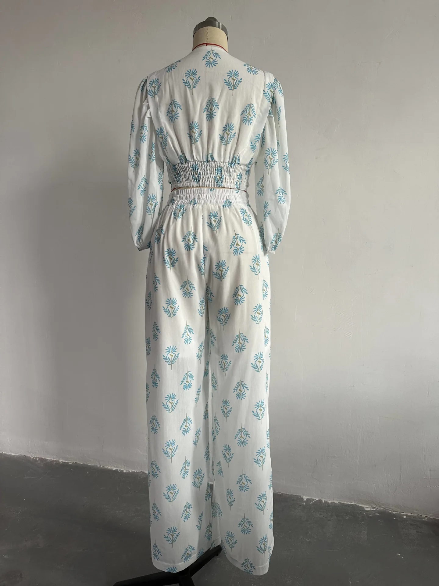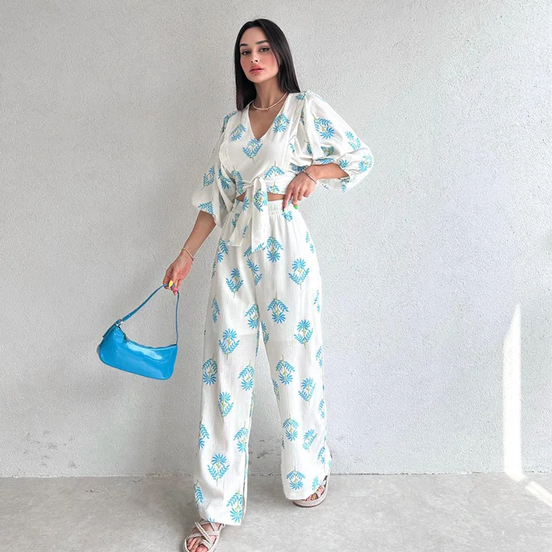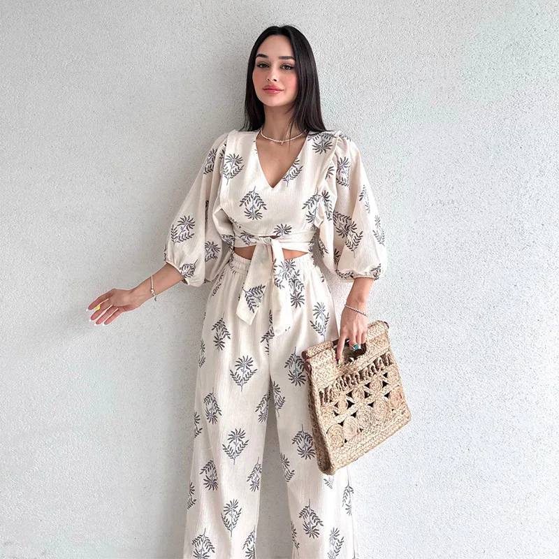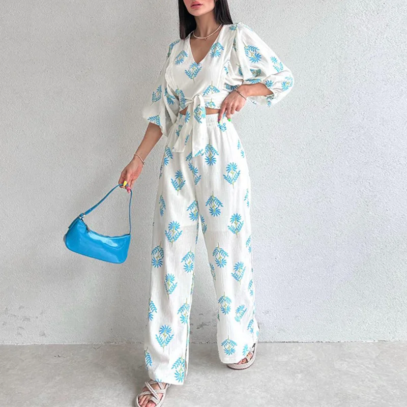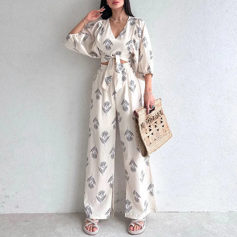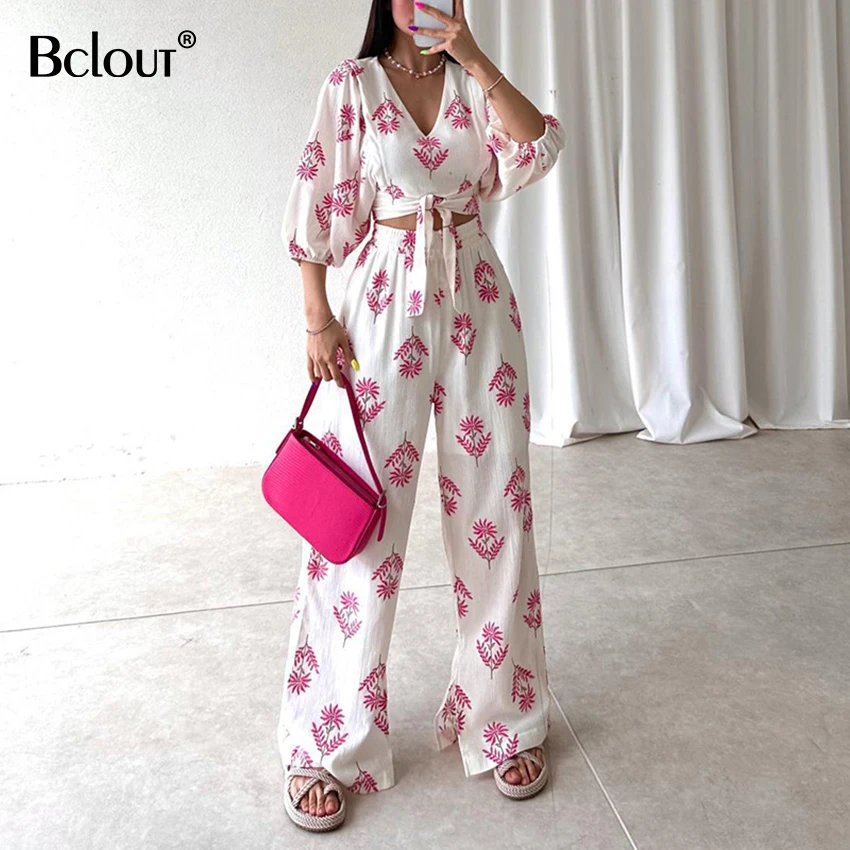 Bclout Fashion Bow Blouse And Pants Two 2 Piece Set Outfit Tracksuit Vintage Women Wide Leg Loose Pants Suit