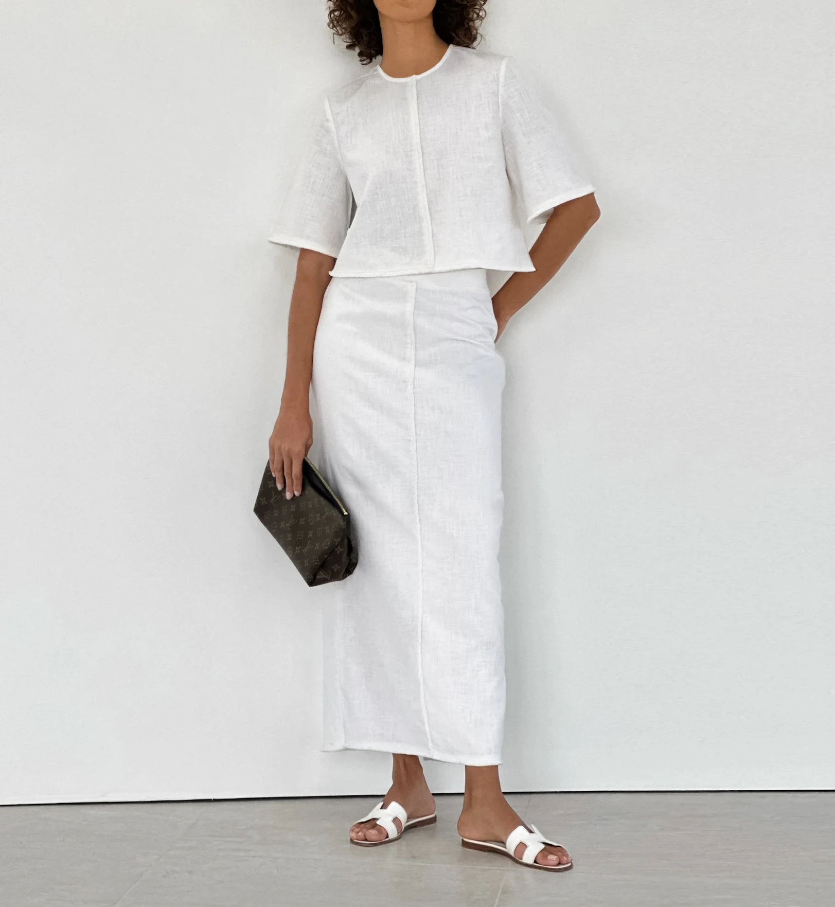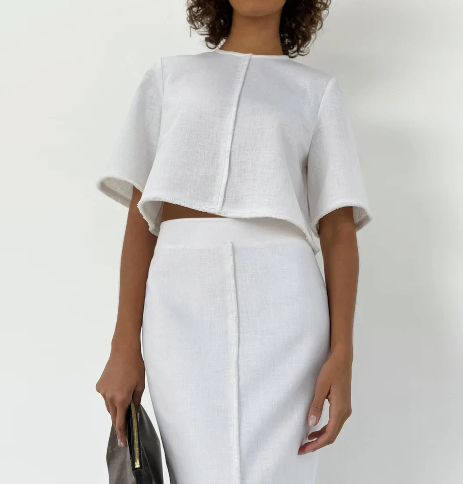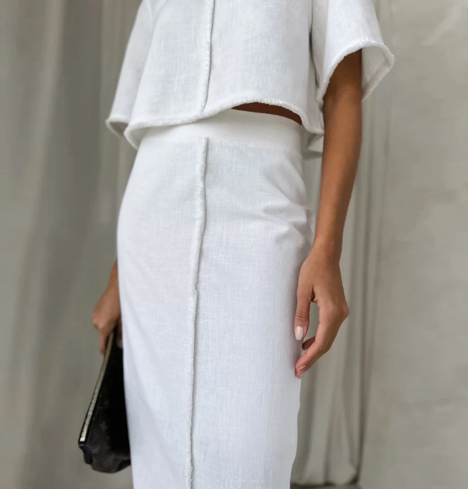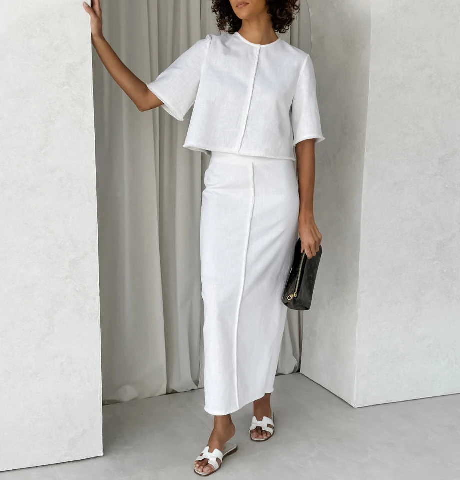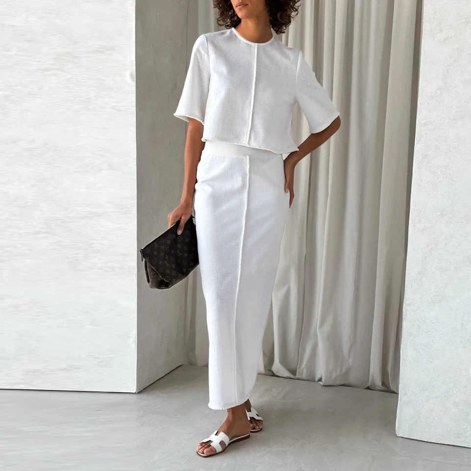 Bclout Fashion High Waist Straight Skirts Suits Womens 2 Pieces Elegant O-Neck Short Sleeve Tops Summer Linen White Skirts Sets