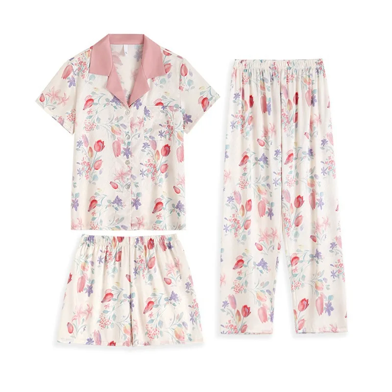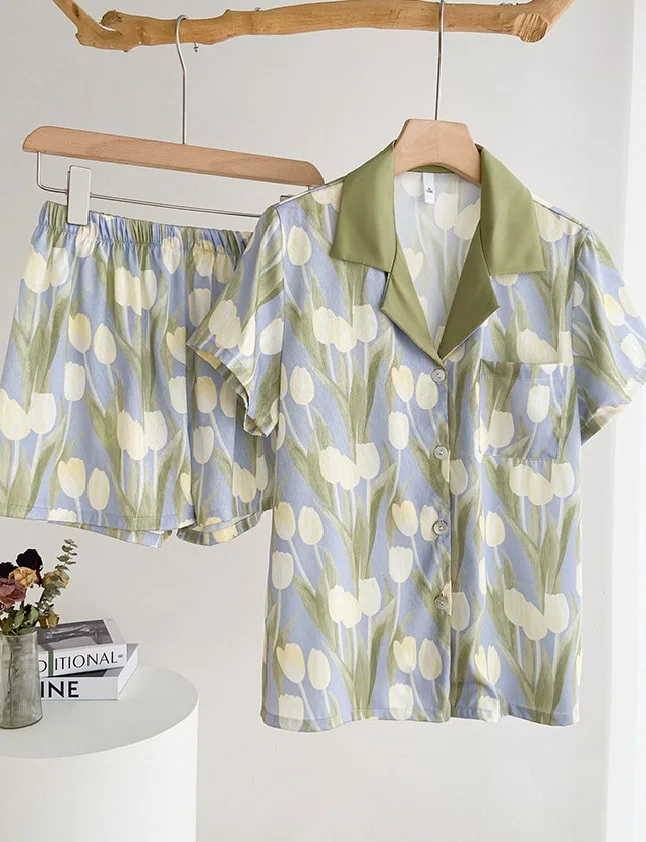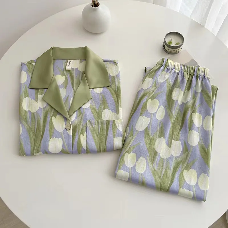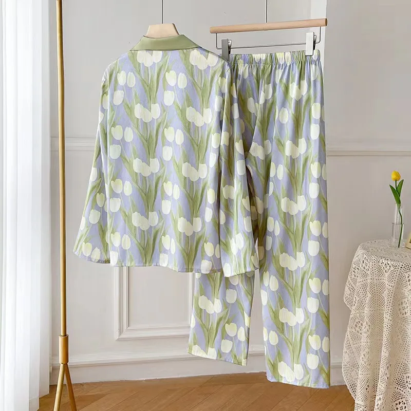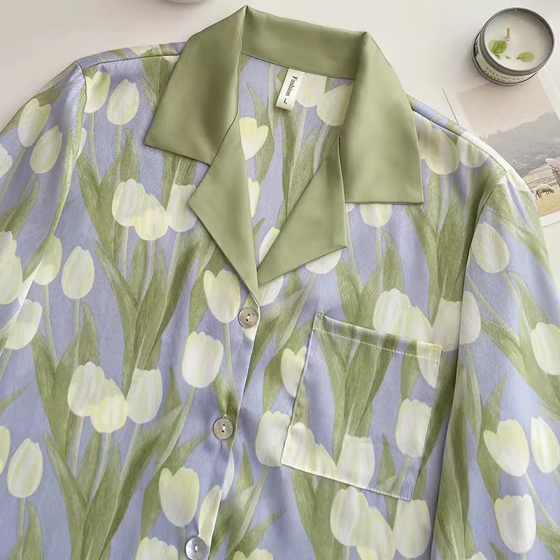 Bclout Female Home Clothes Pyjamas Two-Piece Set 2023 Autumn Thin Cardigan Long Sleeve Sleepwear Women Tulip Print Satin Pajamas