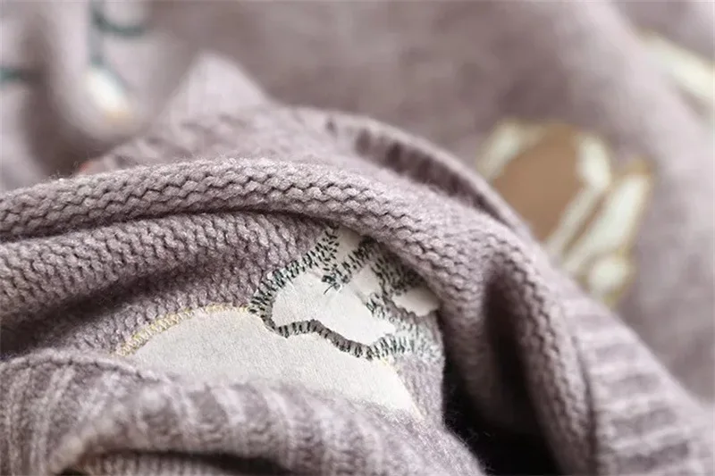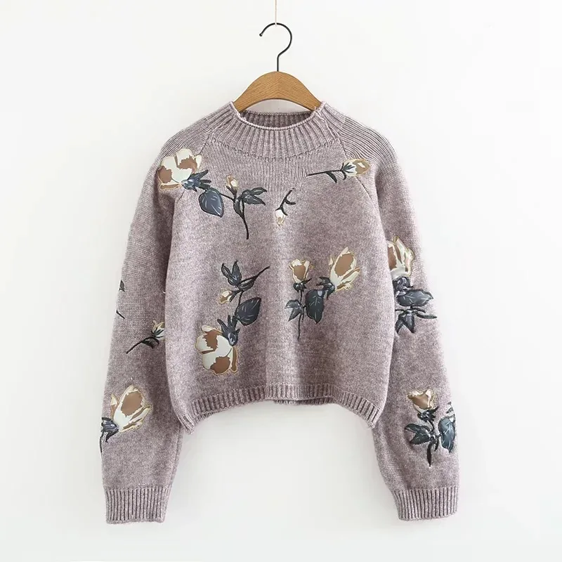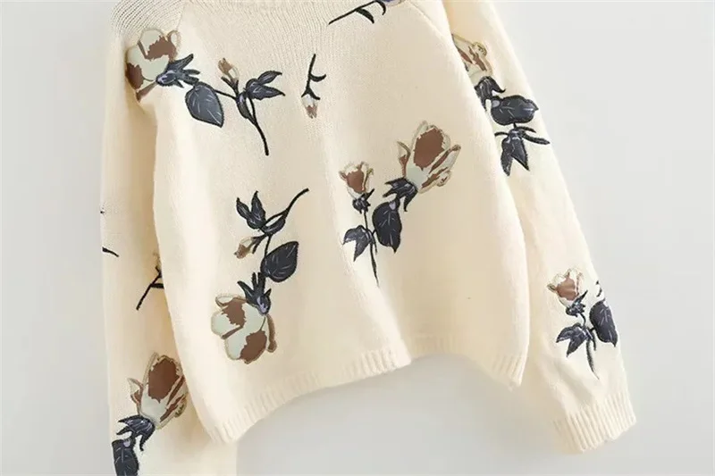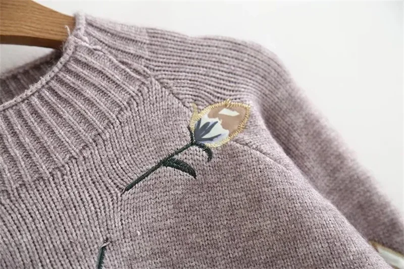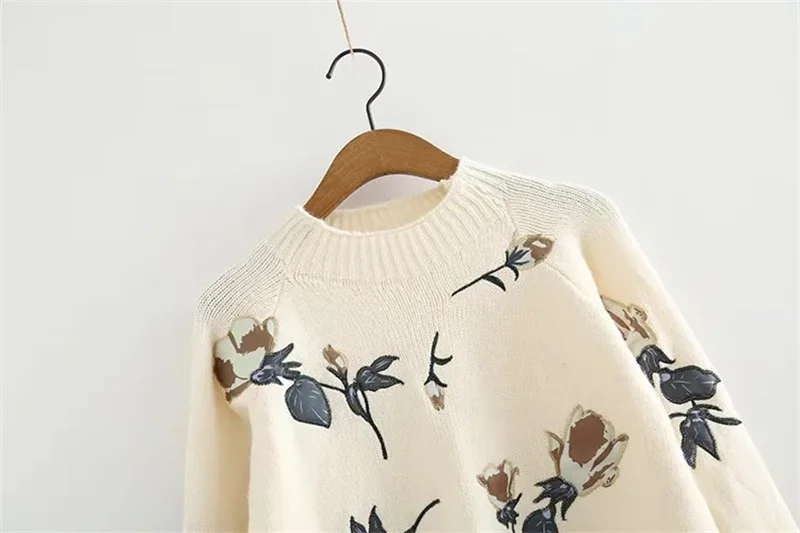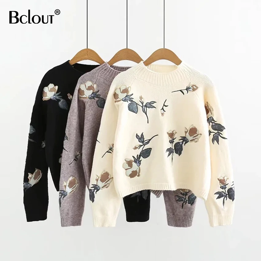 Bclout Female White Blue Thick Long Sleeve Loose Sweaters Women Wool O-Neck Warm Knitted Pullovers Flower Embroidery Sweaters