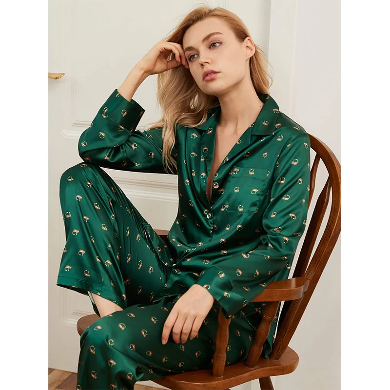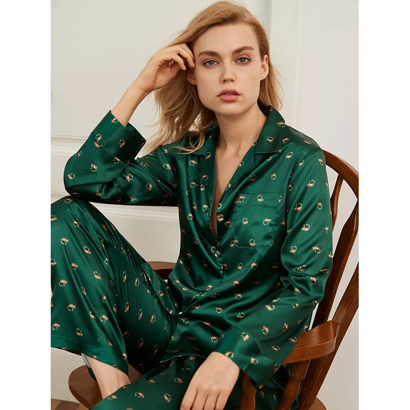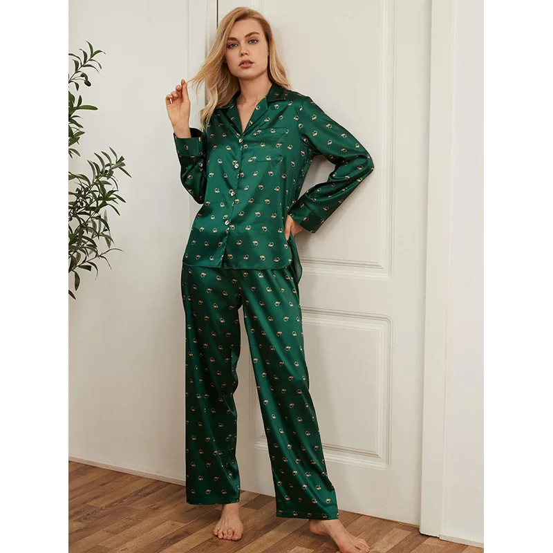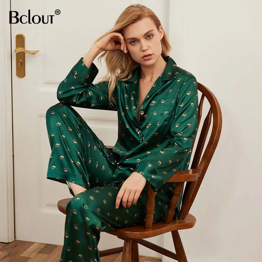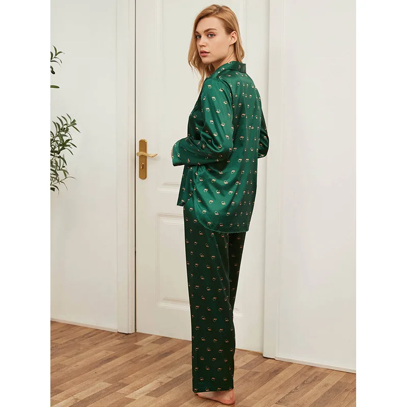 Bclout Femme Loose Print Home Wear Long Sleeve Elastic Waist Shirt Trouser Suit Pyjama Green Satin Sleepwear Female Pajamas Set