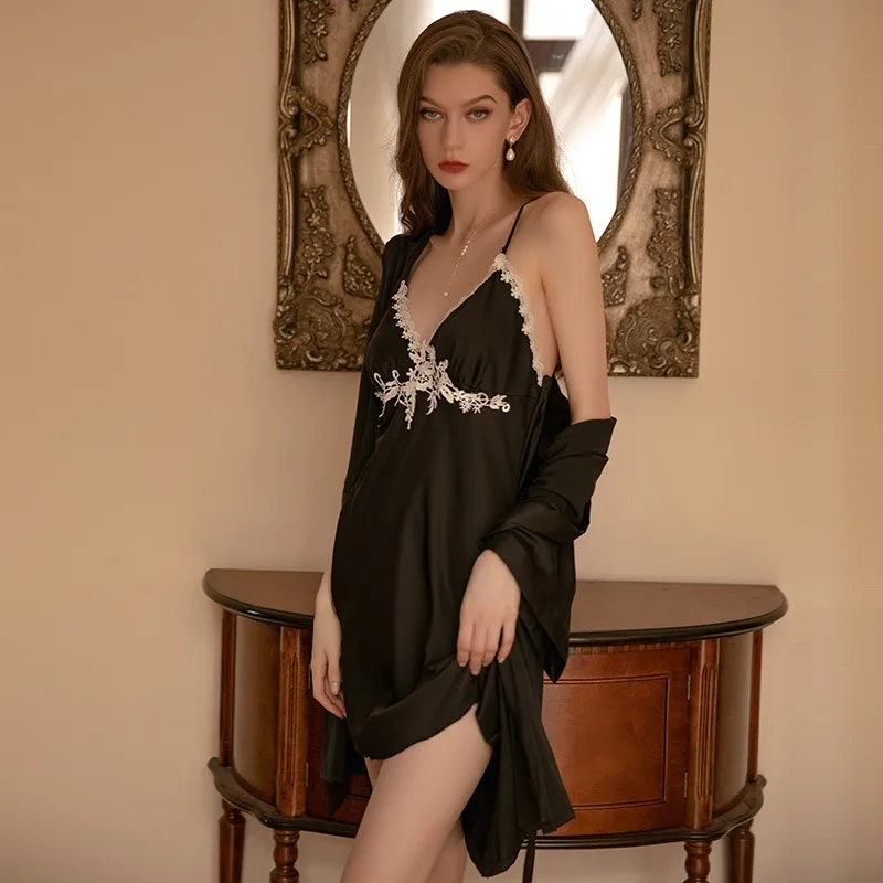 Bclout French Elegant Dressing Gown Nightie Lace Sleepwear Bathrobe Silk Like Robe Sets Women Sexy Nightdress Lounge Wear Set