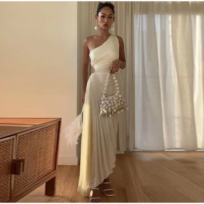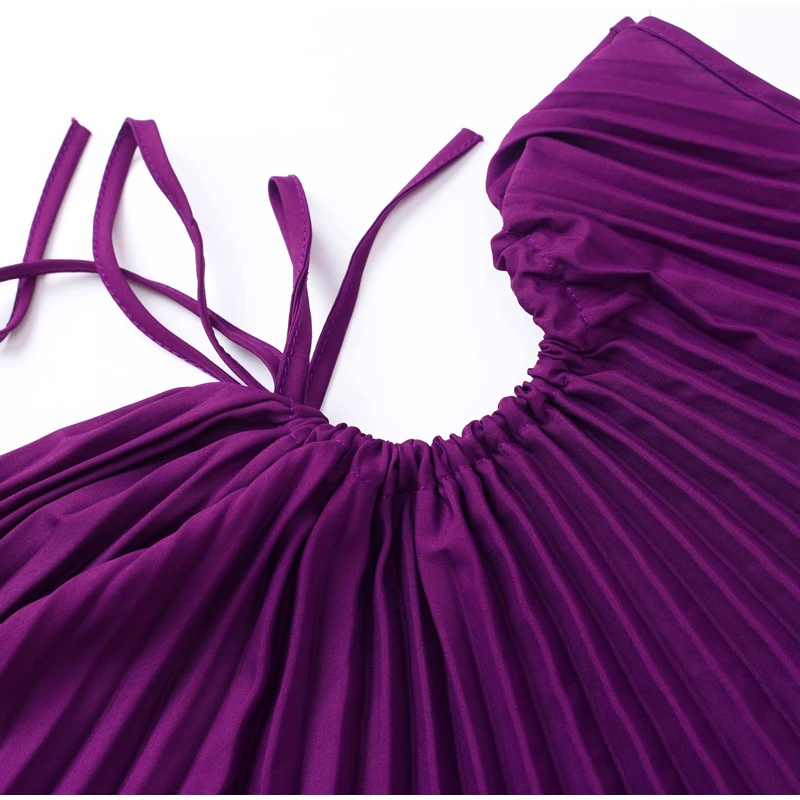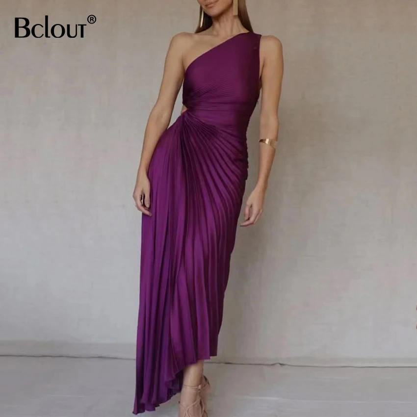 Bclout Lady Women Backless Sleeveless Irregular Dress Purple Pleated Diagonal Collar Maxi Dresses Ruffled Elegant Dress