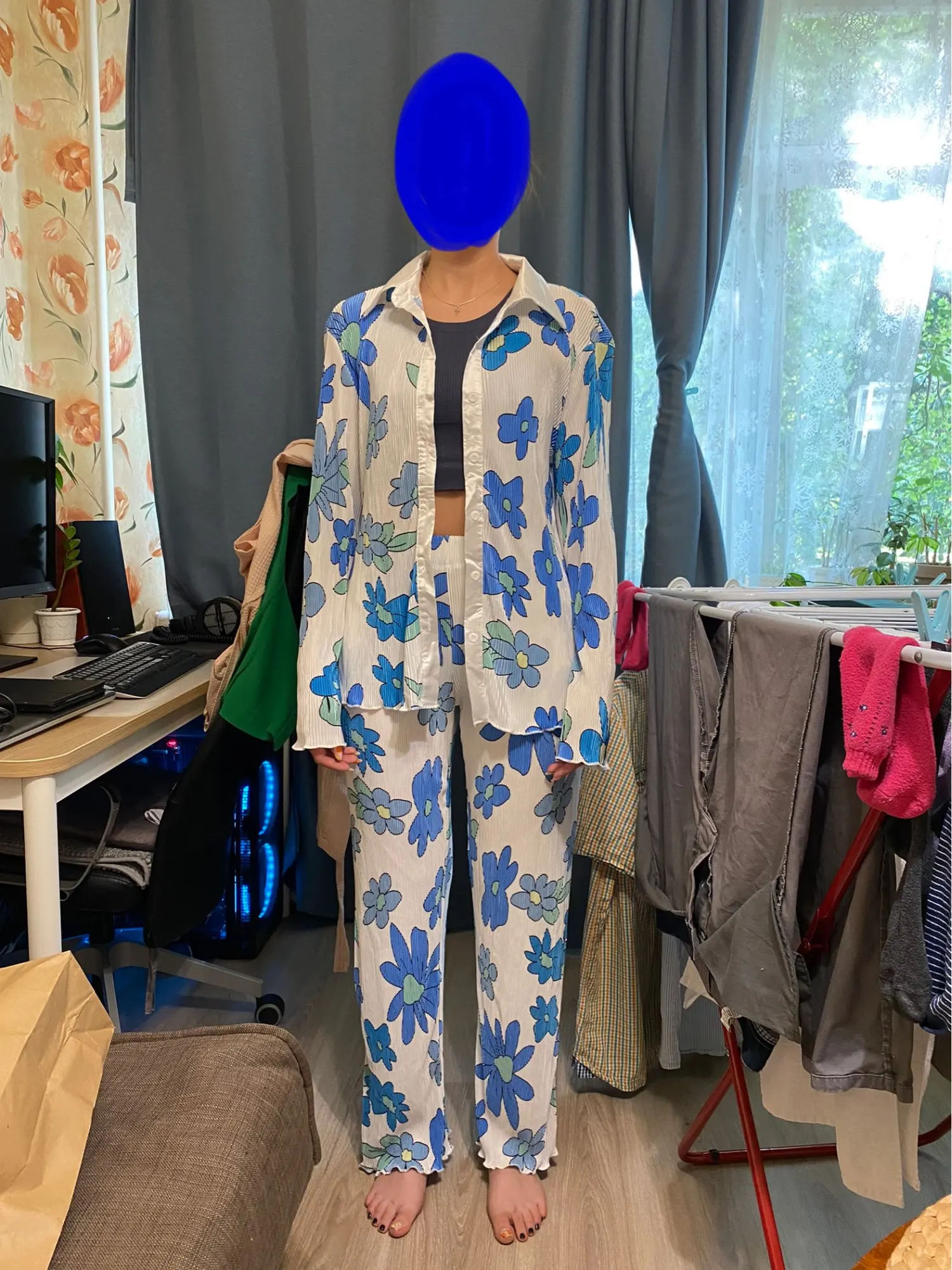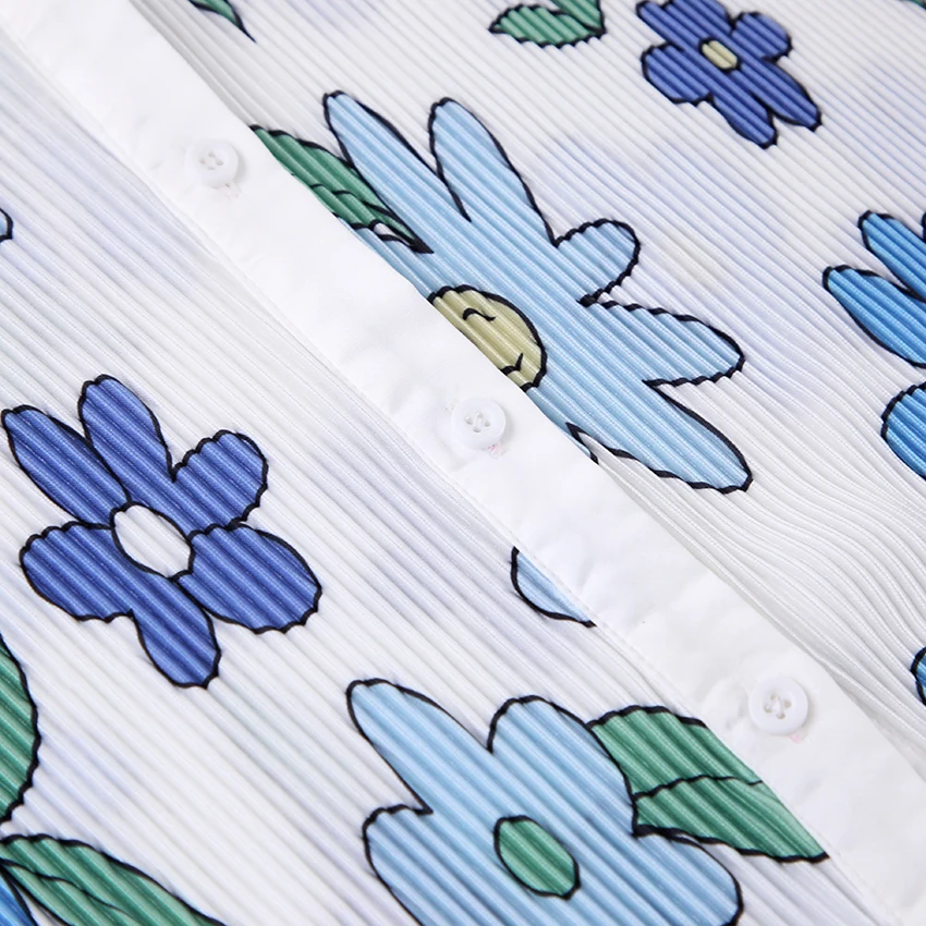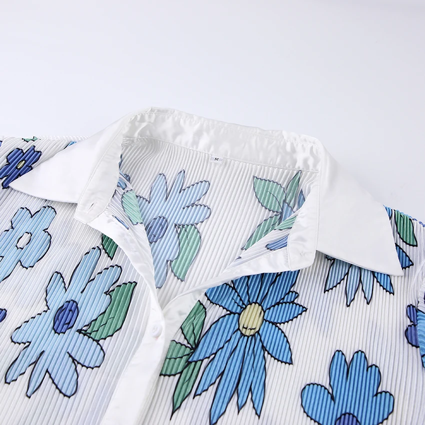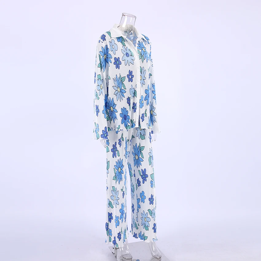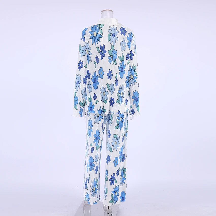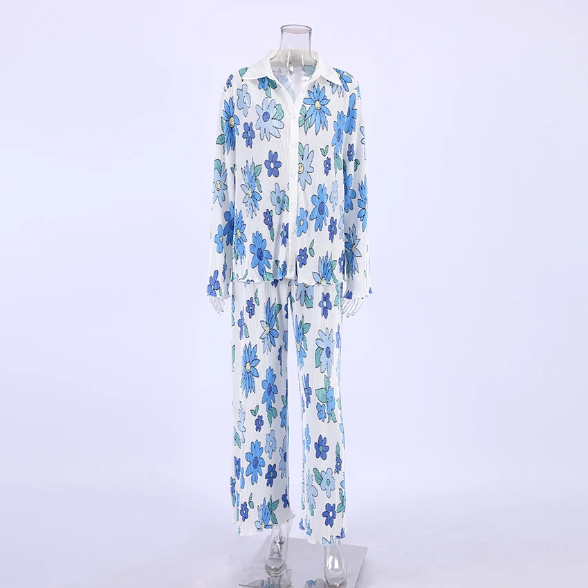 Bclout/QINSI Female Loose Shirts Two Piece Pant Set Floral Elegant Casual Long Sleeve Blouses Pants Set Women's Pleated Set